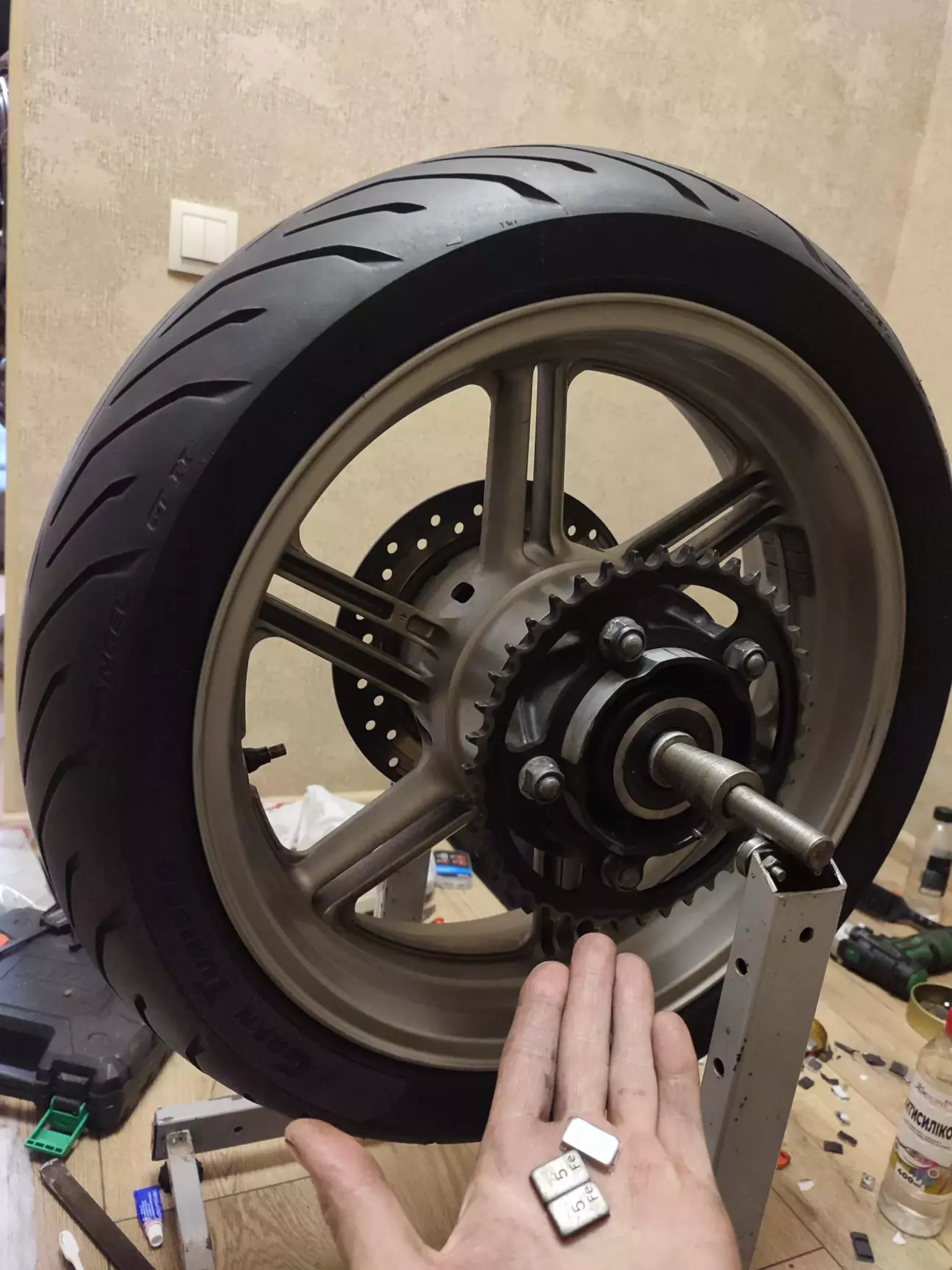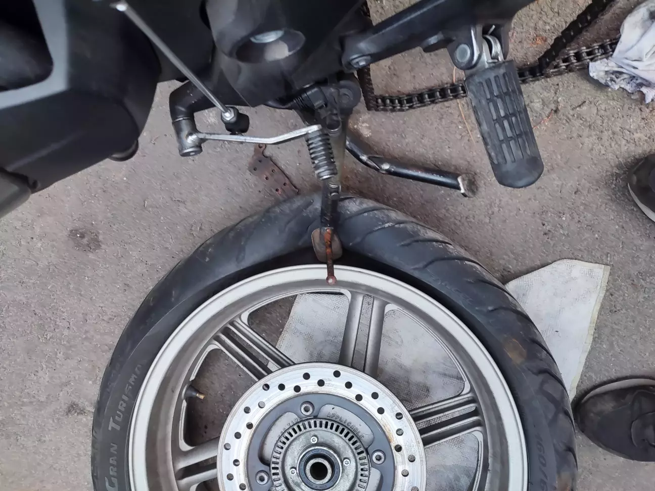 Ремонт колеса після того як я спіймав шуруп я екстрено робив жгутиком але через деякий час колесо почало підспускати. Тож на новий сезон вирішив заклеїти нормально. Так як я тру байкер то ні про який мотошиномонтаж з лавандовим рафом по ціні нової покришки мови навіть не йде. Згадавши мотоюність без прав, шоломів і екіпу я застосував лайфхак з бортуванням покришки боковою підніжкою.