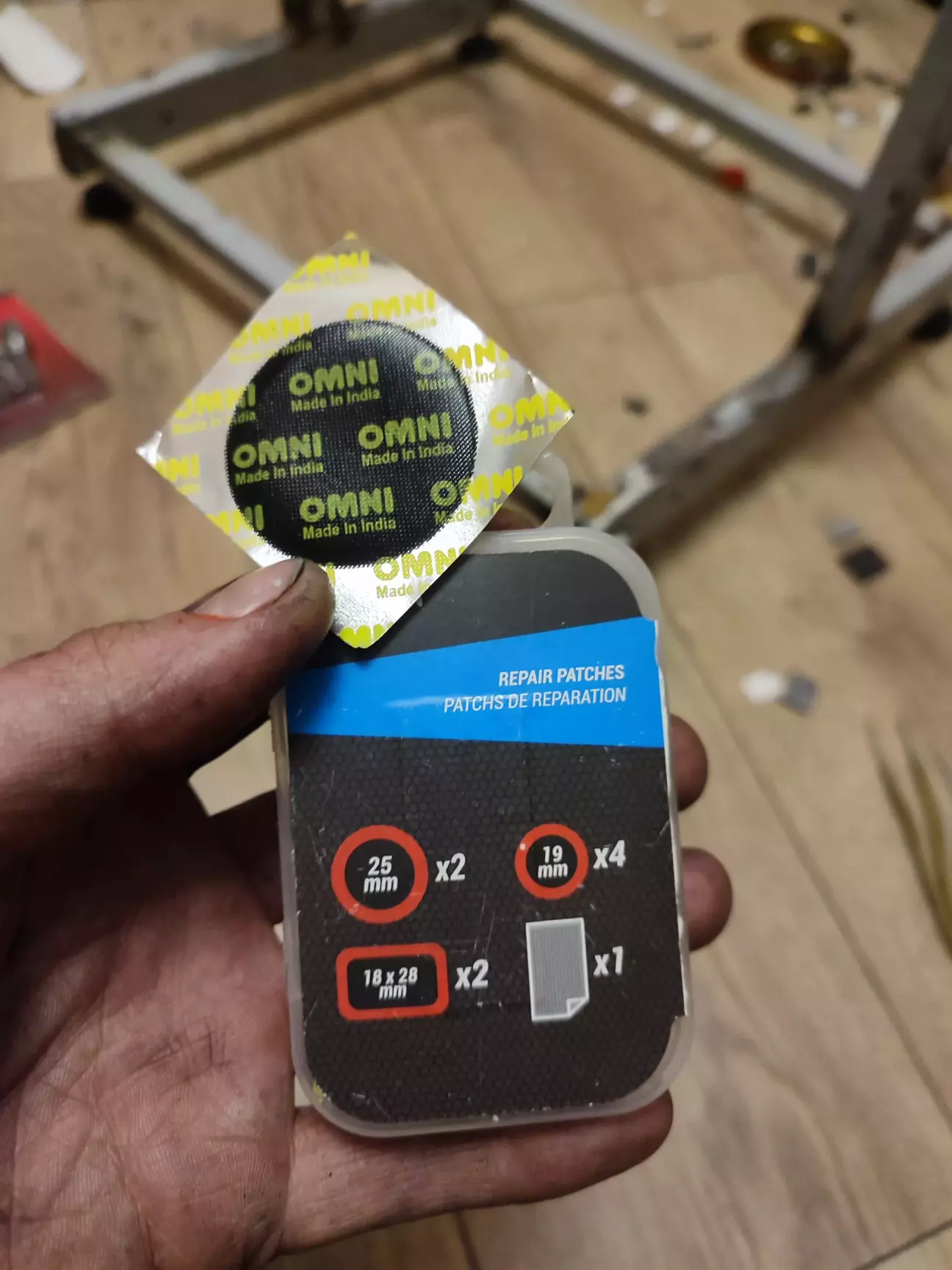 Далі все як завжди - дві лопатки, трохи матюків, придавлений палець і покришка знята. Набір з декатлону якраз пригодився, найбільний пластир підійшов.