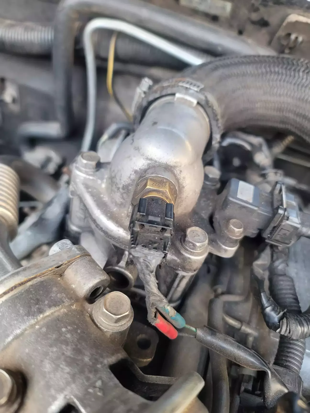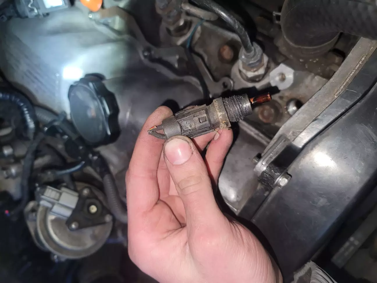 Продалжаю тему свечей накала. На улице потеплело и решил заняться проблемой. Пообщавшись с многими людьми на форуме начал грешить на датчик температуры. Найдя их, обнаружил такую картину: