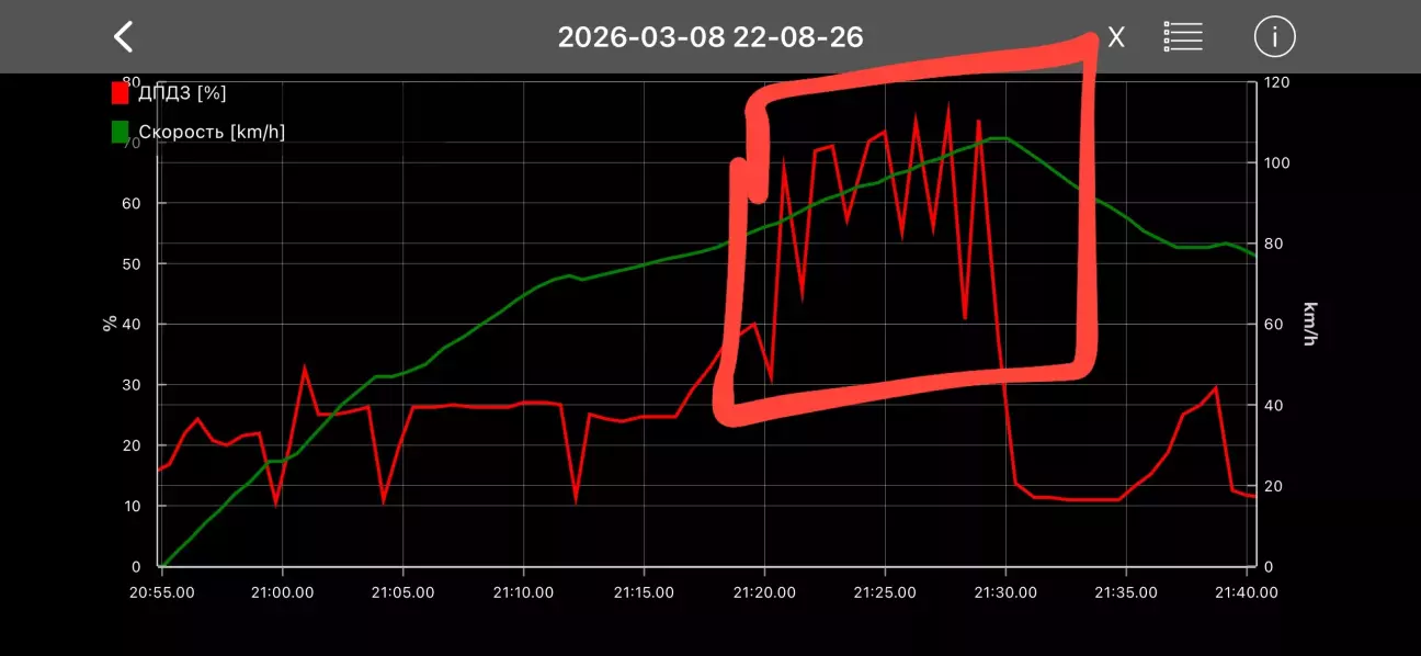 Если держать газ на 50-80%, особенно в горку, машина начинает разгоняться волнами, будто кто-то дроссель дергает туда-сюда. При этом на газе в пол тяга равномерная.