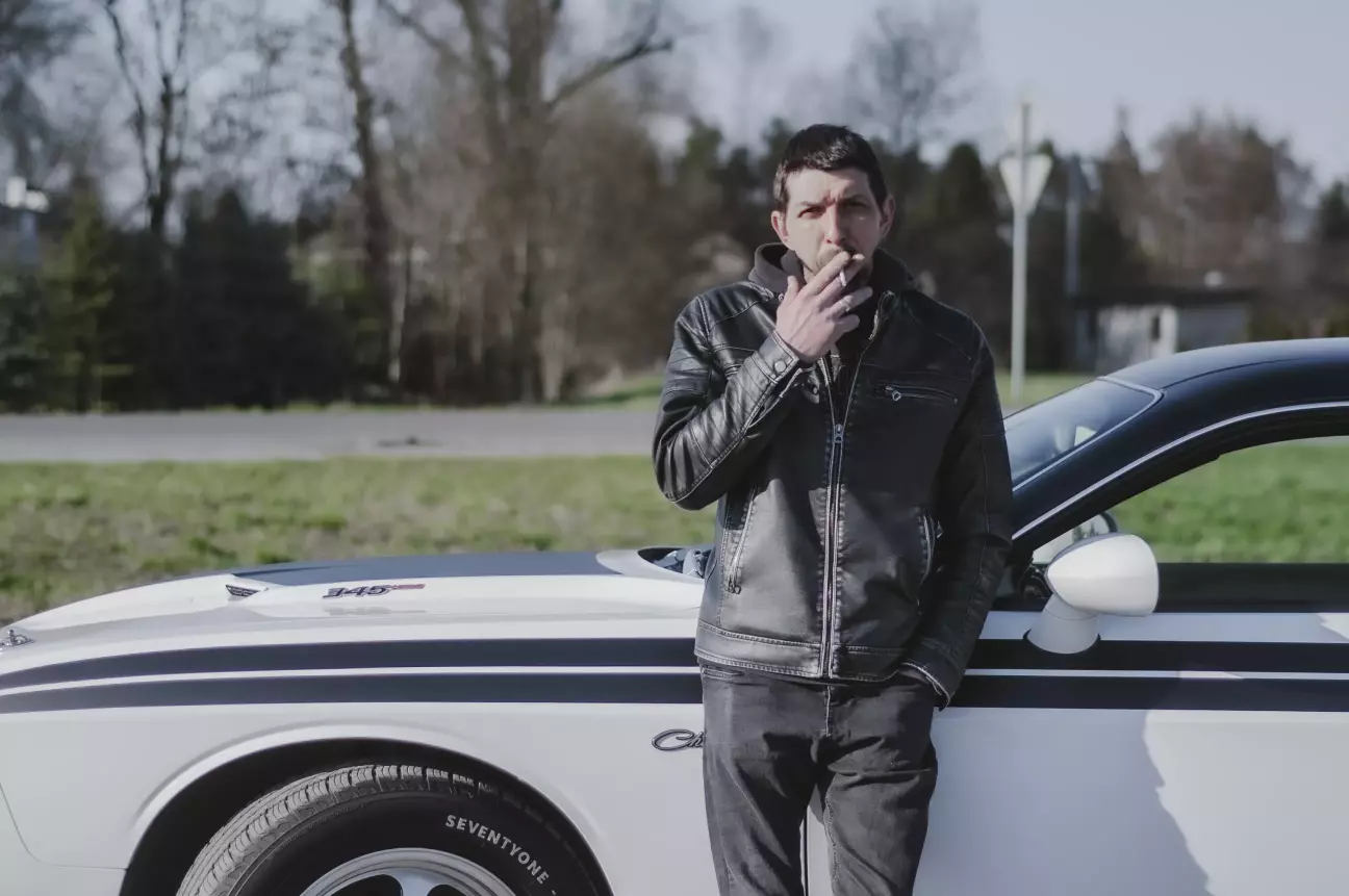 До фотосесії жоден з нас не готувався, локації не обирав, все природньо в стані «як є» і в місці «де прийдеться». Єдиною вимогою мого тезки було пересунути автівку на кілька метрів, що я не без лінощів зробив. В ту саму мить клацнув спуск, і, як то часто буває, випадковий гонзо кадр вийшов не гіршим за постановочні. Це, напевно, перша фотографія, на які видні куці залишки стопсигналів після їхньої адаптації до євростандартів. Мої очі в дзеркалі надто влучно це імітують: