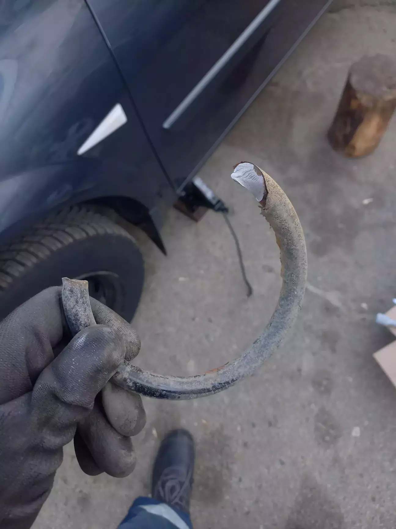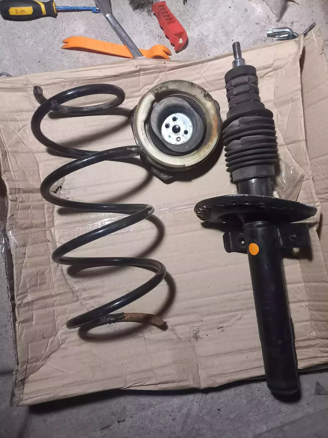 Кажуть, що техніка має працювати, бо в гаражі вона починає "сумувати". Мегаша сприйняла це занадто буквально. В середині січня поставив її на відпочинок, а через місяць зайшов провідати та підзарядити акумулятор. Перше, що побачив на підлозі — шматок металу. Придивився — обломаний виток пружини. Мац-мац під аркою - моя. Подивився іншу сторону, а там та ж картина, тільки обломок залишився лежати прямо в чаші амортизатора.