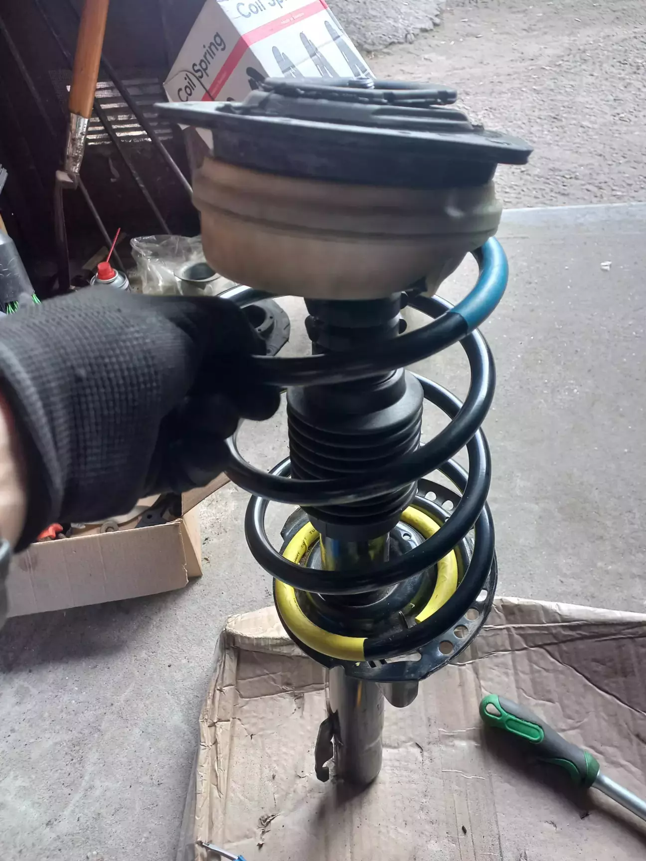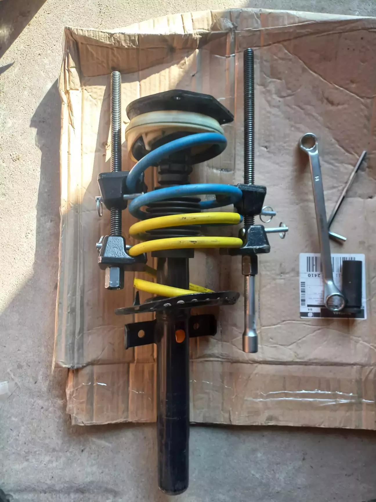 Далі по плану в мене було максимально опустити машину щоб пружина стиснулась, надіти стяжки, відкрутити болт кріплення стійки до кулака щоб при підніманні стійка виходила з кулака, а пружина залишалась стисненою. Ідея хороша, але реалізувати її на практиці не вийшло. Коли дійшло до встановлення стяжок виявилось, що конструкція конкретно тих, що в мене були не дозволяла нормально їх зафіксувати прямо в арці. Тому просто стандартно розкрутив болт кулака, вивів стійку і стягував пружини вже на землі. До речі, порівняно з новими старі пружини взагалі безпроблемно стискаються.
