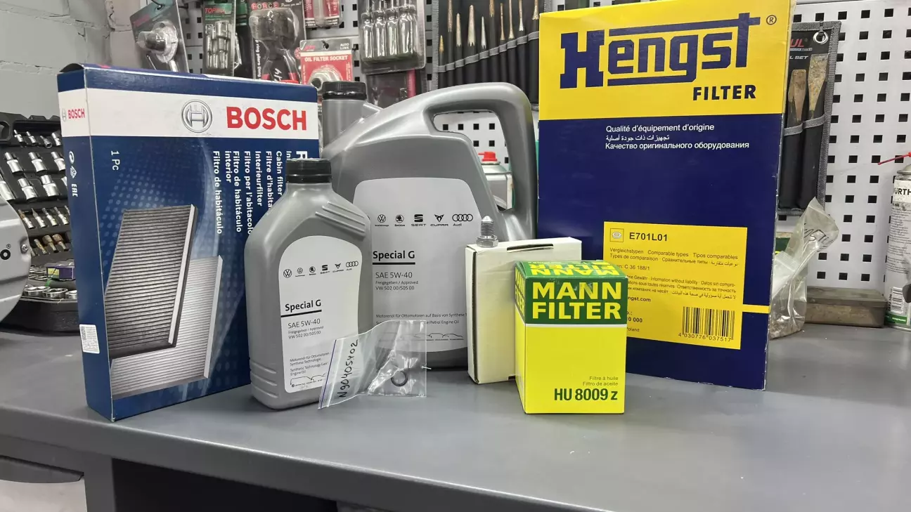Щодо фільтрів то тут стандартно по оливі фільтр від MANN, фільтр салону - BOSCH. Єдина зміна відбулася по повітряному фільтру. Знов ж таки, обрав досить гарної якості фільтр від Hengst, який також як і MANN йде з додактовою нижньою мембраною (префільтр для холодного клімату). Ця мембрана працює як своєрідний додатковий фільтр перед впуском, що унеможливлює потрапляння снігу чи криги під час руху автомобіля по трассі на паперову основу фільтру, яке може призвести до розмокання основи фільтру та його "цементування". Також цей префільтр є своєрідним додатковим стопором від частинок бруду. Нічого проти фільтрів MANN не маю, але коли є два гарних варіанти, але один із них дешевше, то вважаю, що можна обрати приємніший для гаманця варіант. Ну і також серед розхідників традиційно супутні дрібнички (нова зливна пробка піддону та гумове кільце-ущільнювач зливної пробки корпусу стакана масляного фільтра).