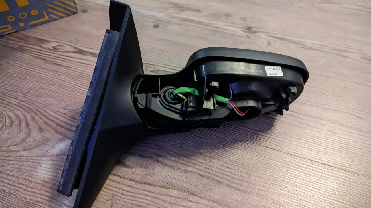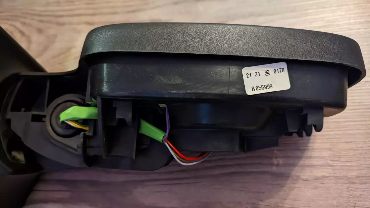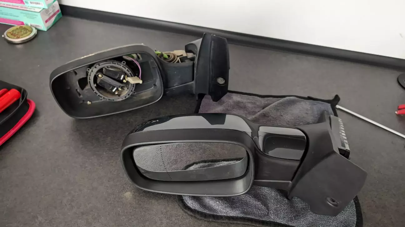 Заміна досить легка: 2 гвинти під Torx 20 на стійці (якщо відкрити двері) і на 27 (треба повернути дверкало вперед і він буде в щилині між трикутником і самим корпусом), відключити фішку, зняти дзеркальний вкладиш і відключити фішку обігріву, зняти кольорову накладку. Збирати у зворотній послідовності.