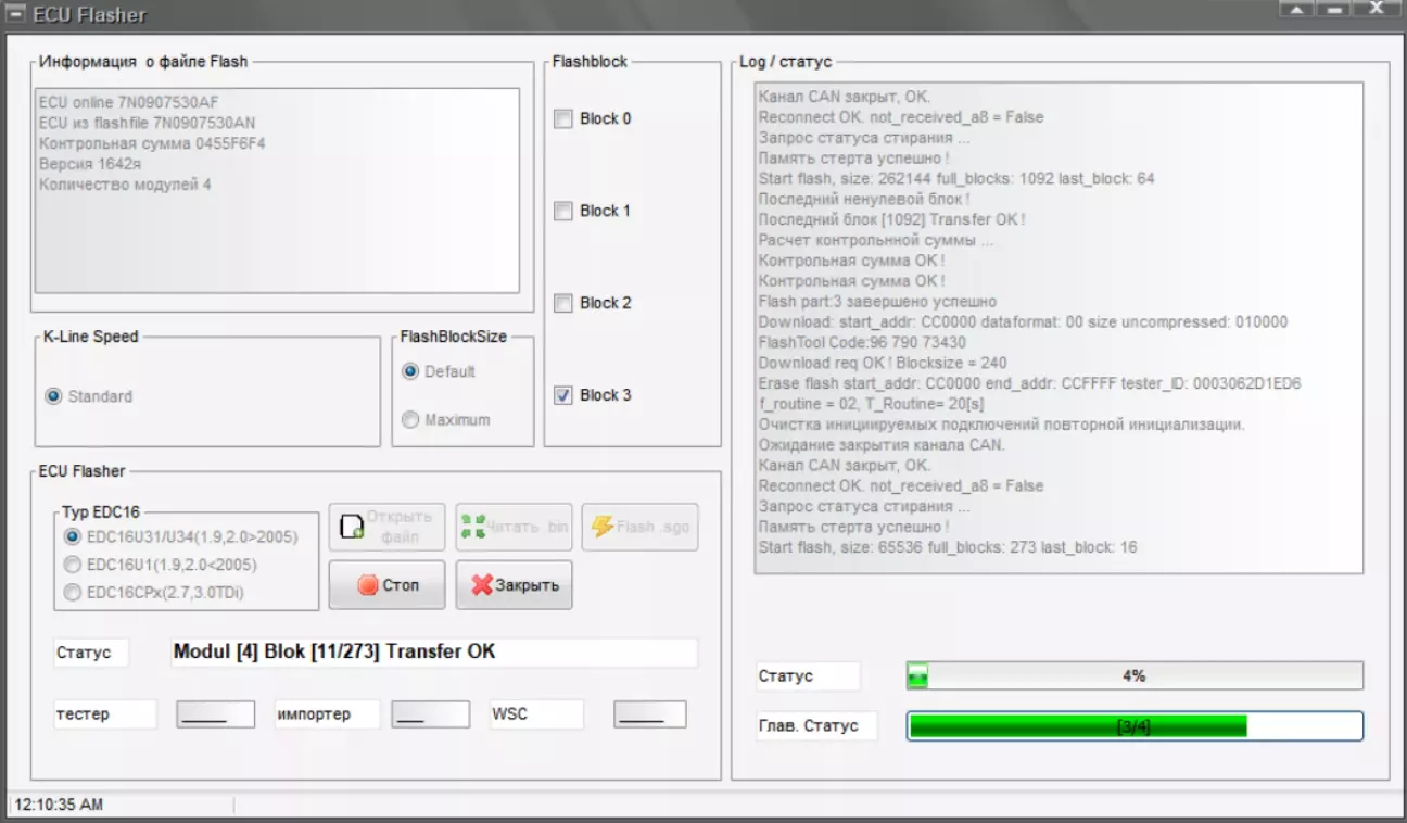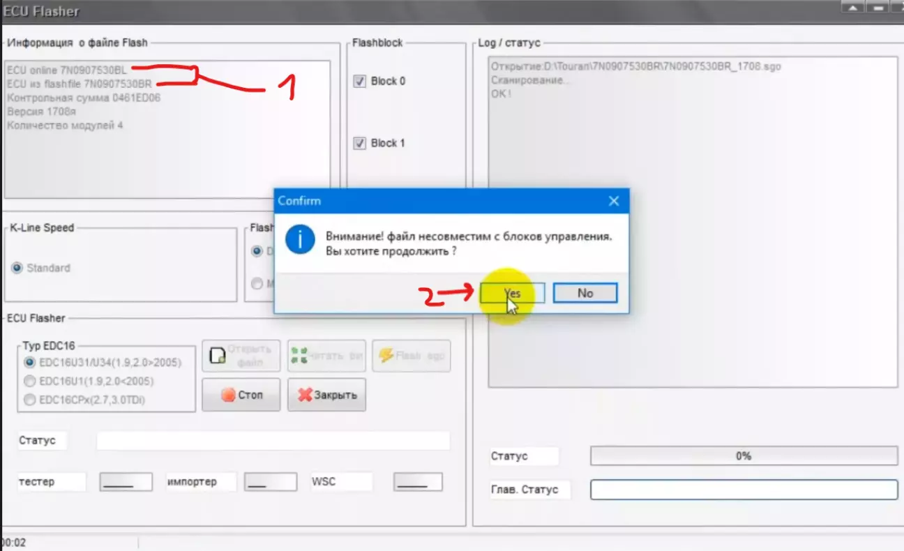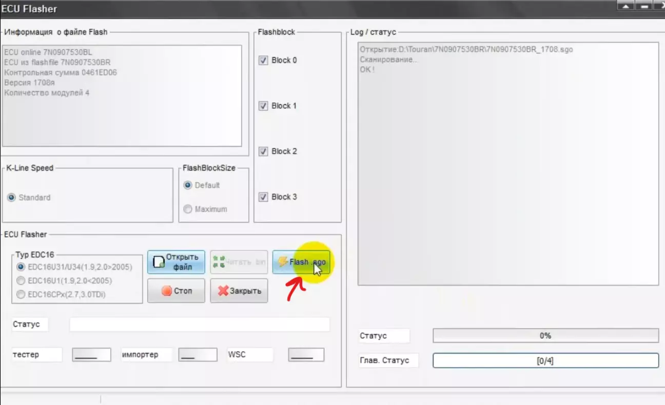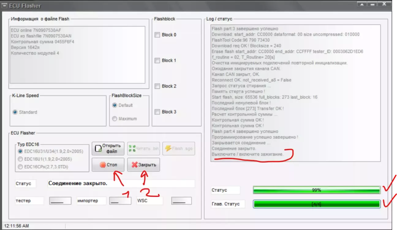 Далі, коли всі 4 блоки записані, процес доходить до 99% та зупиняється з написом виключити/включити запалення: