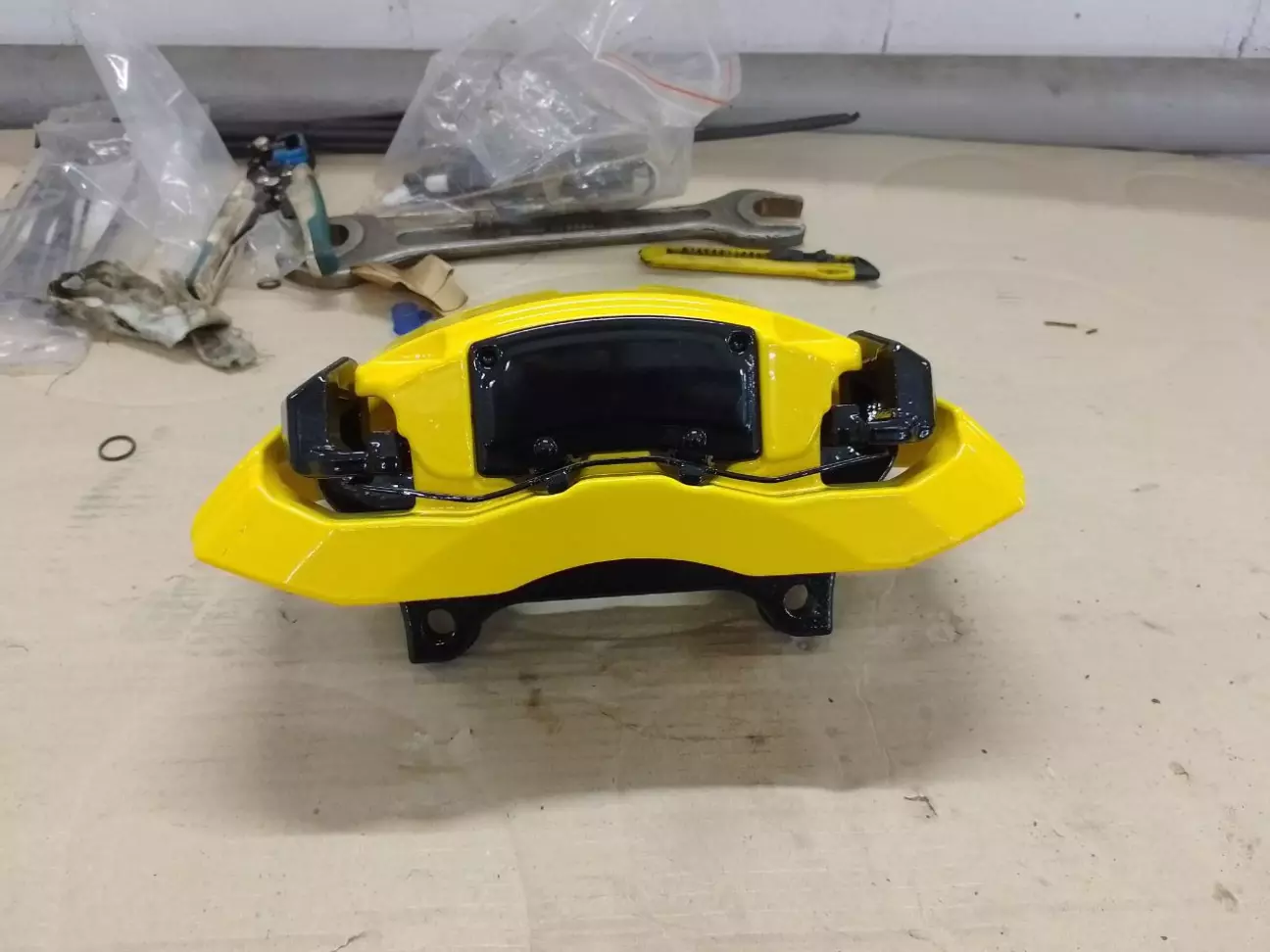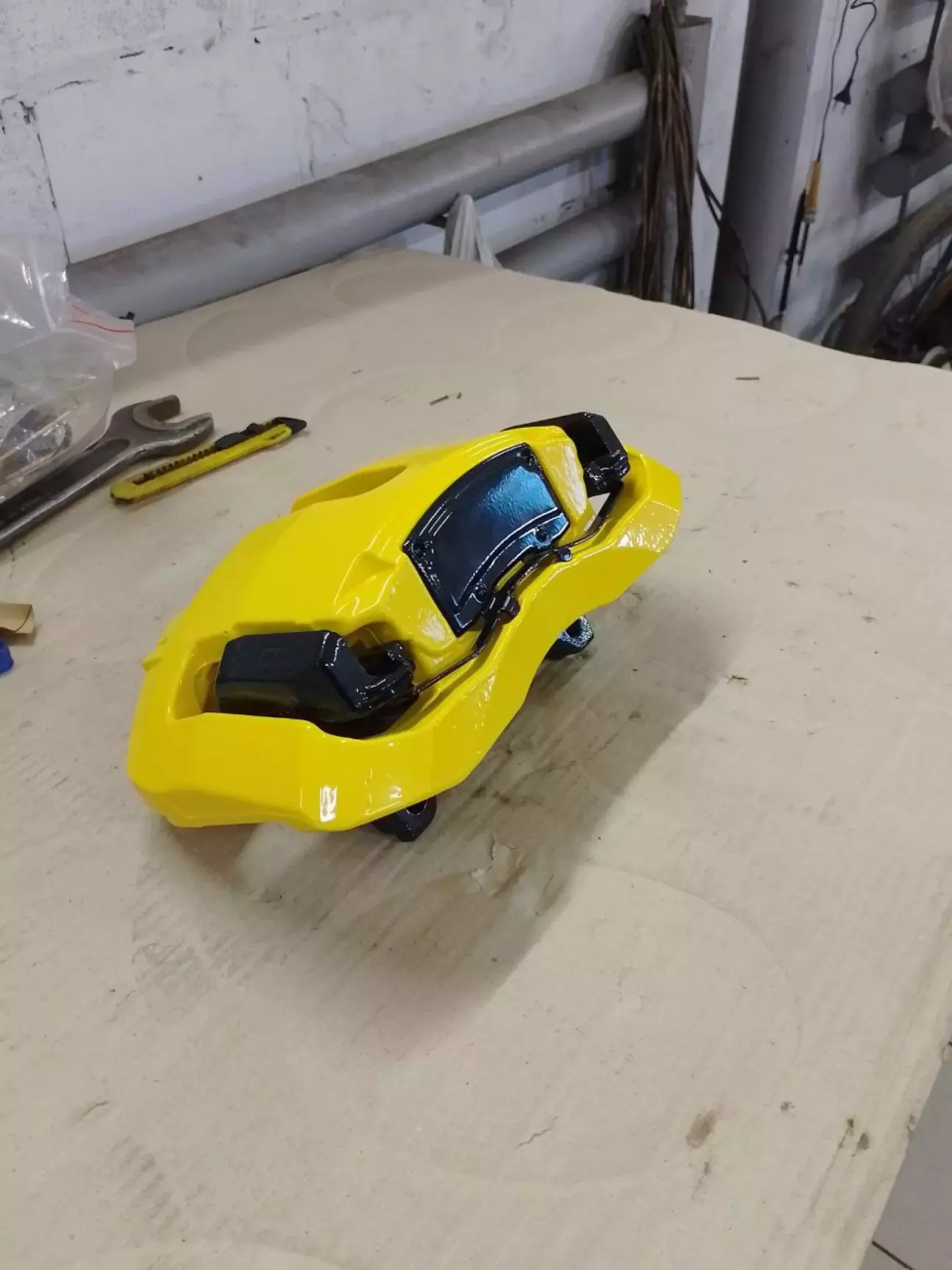 А ось і вона - коробка із пофарбованим залізом. Передні скоби та прижимні пластини були пофарбовані в чорний колір, а сам супорт - жовний. Не хотілось мати велику жовту пляму (як було б з "дольками"), тому чорна фарба візуально розбила масивний супорт на частини. Задні ж і супорти і скоби пофарбовані в жовтий - досить добре видно чорну гальмівну колодку, то ж вона і буде додавати чорних зон.