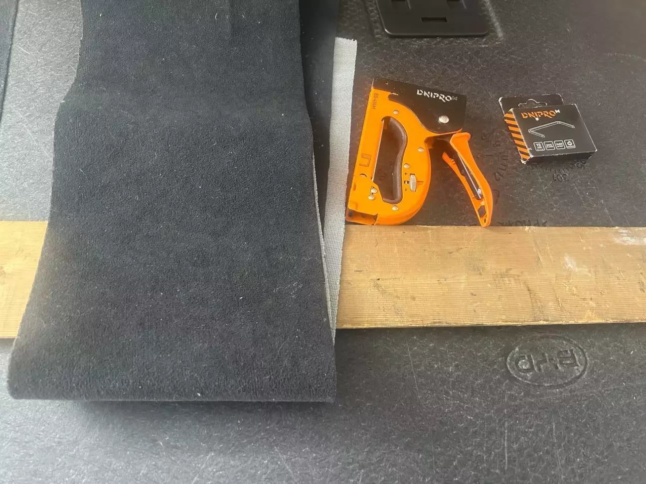 степлером прибив її до дощечки і прикрутив на три саморізи до дальньої внутрішньої сторони кришки багажника для естетичного вигляду.
