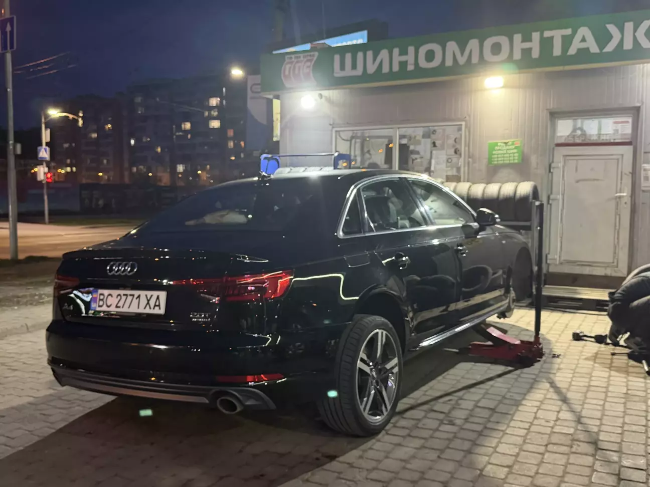 Хотів вже діставати докатку, але дякую велике людині на теслі яка зупинилась, дала насос і допомогла доїхати до шиномонтажу. По дорозі декілька раз підкачували колесо, щоб не порізати гуму.