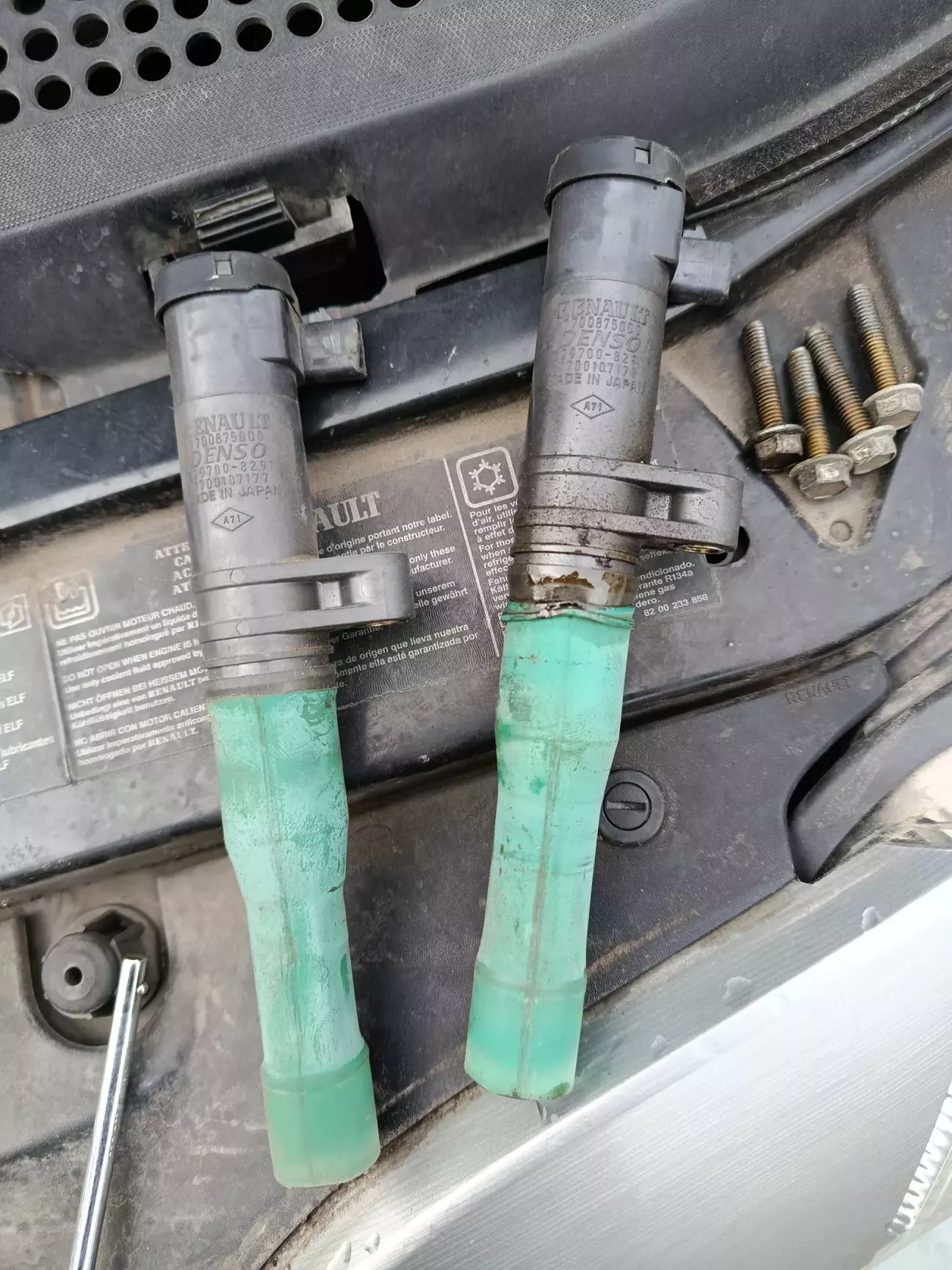Так як свічки я змінював на нові оригінал і пройшли вони всього 5000 в основному по трасі, то залишається найімовірніше котушки запалення. Зняв усі котушки – вони всі оригінальні Renault Denso. Я думаю вони ще рідні, бо всі котушки вже затягнуті термоусадкою, тобто вже хтось до мене вже намагався виправити проблему пробою через наконечник на корпус. У свічкових колодязях майже сухо, води точно немає.