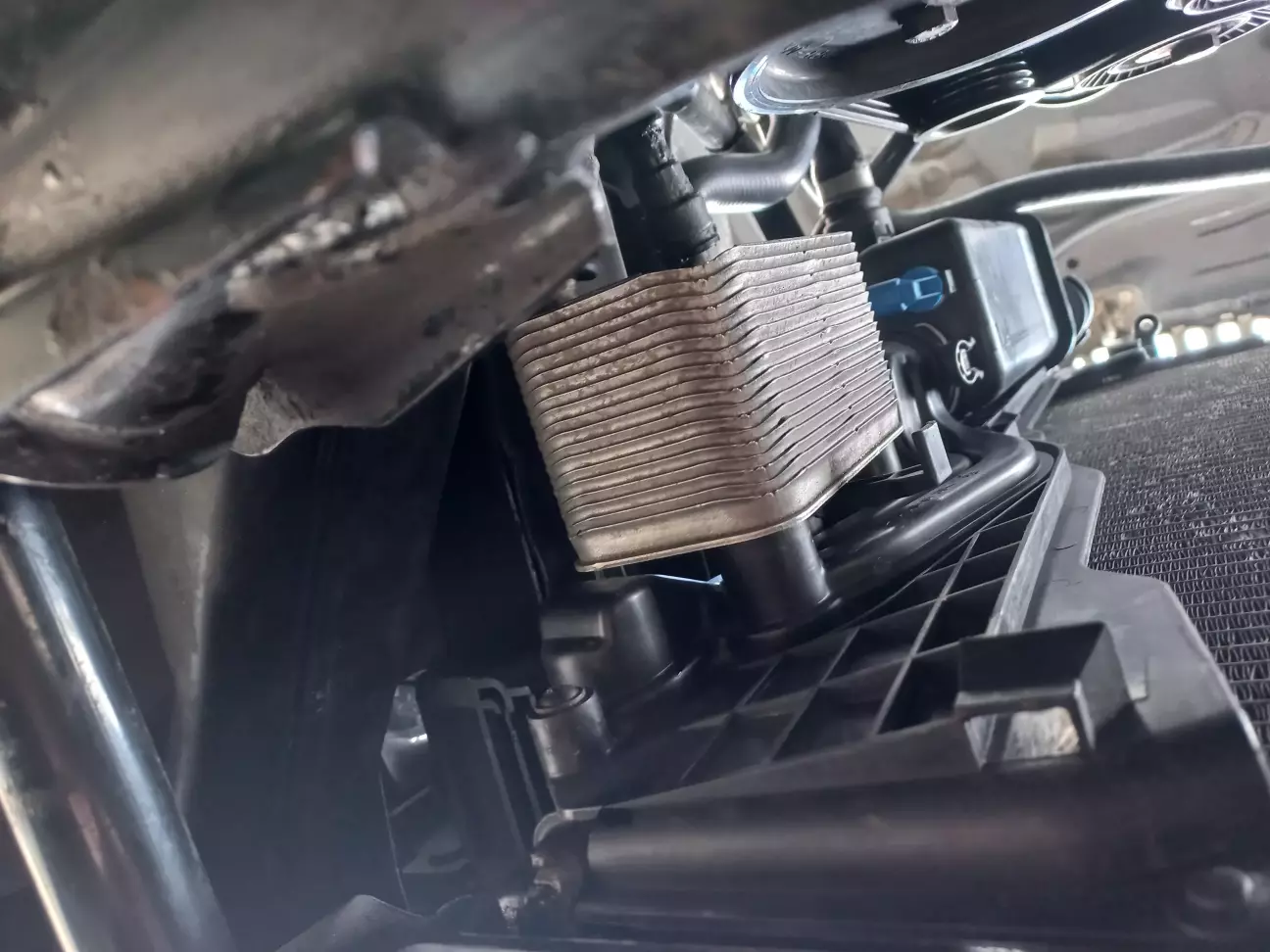 І дивлячись знизу, одразу стало зрозуміло, де тече - нижній фланець термостата АКПП.