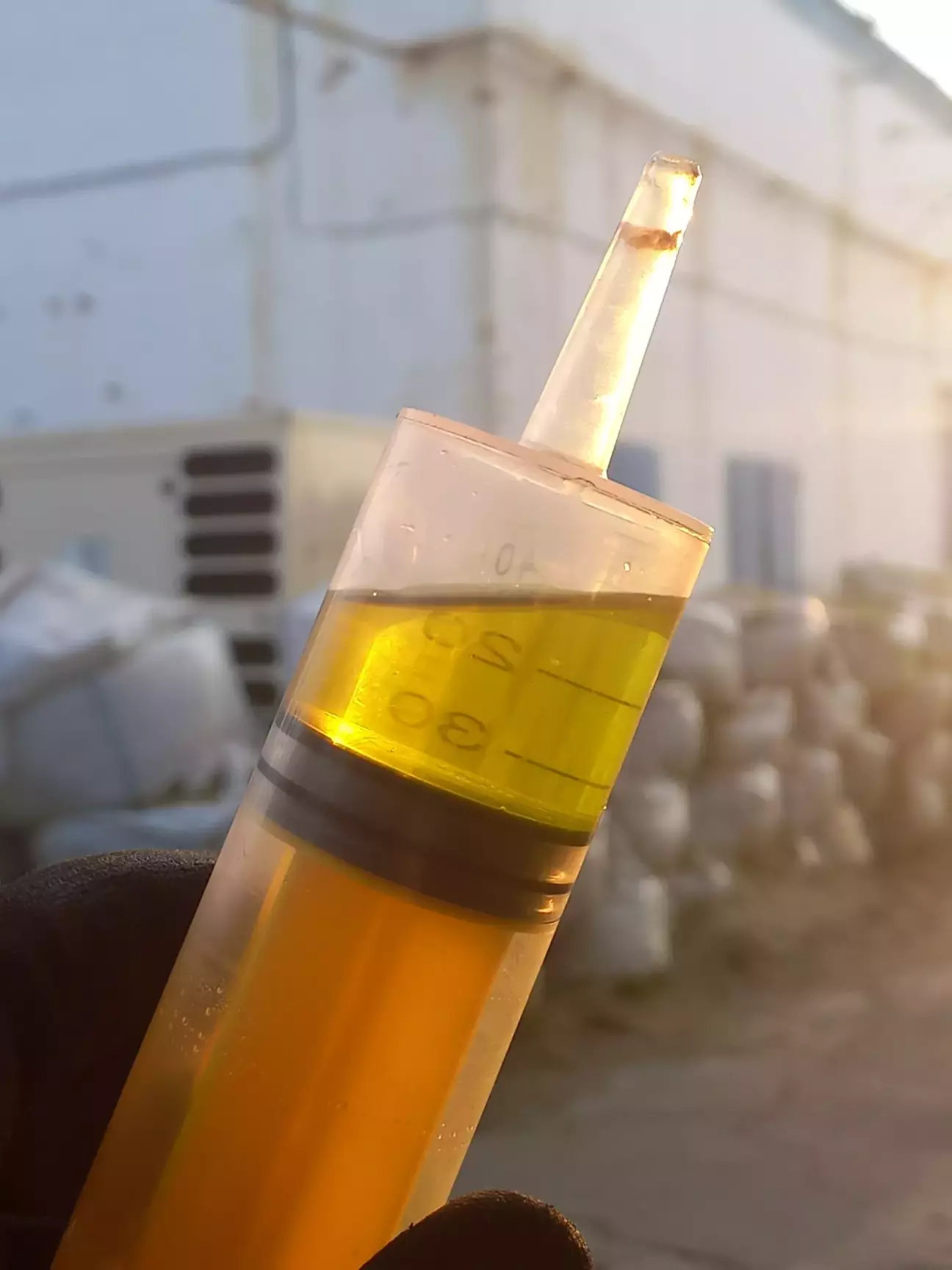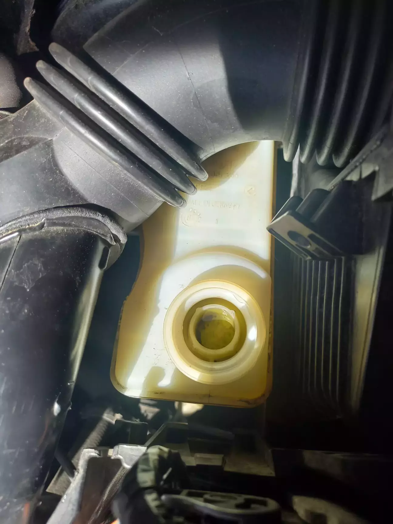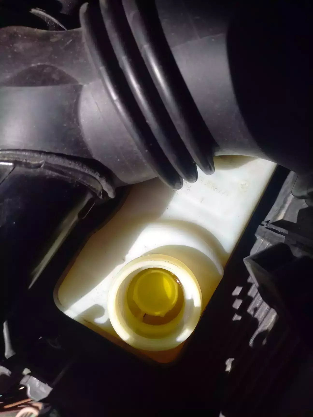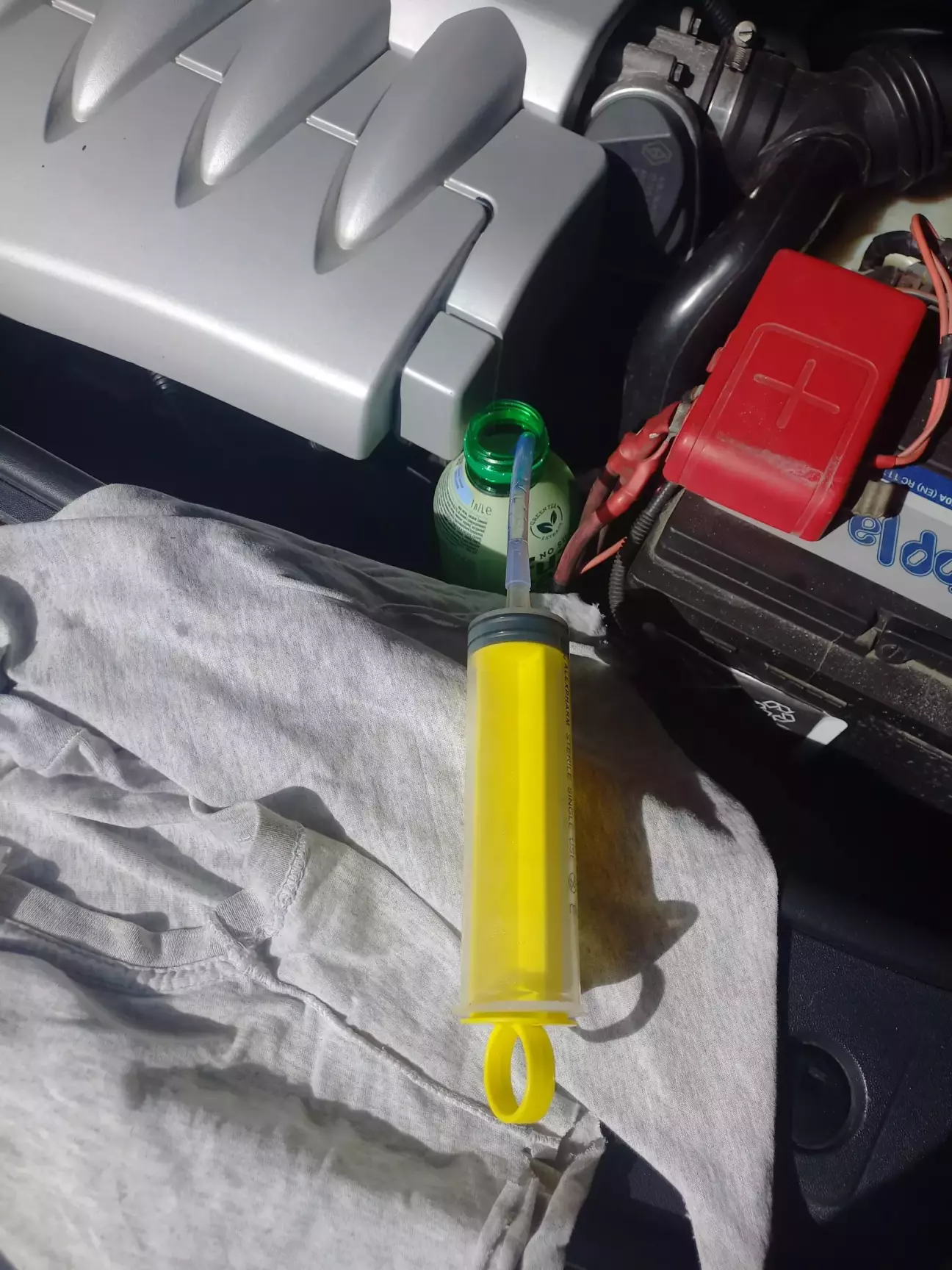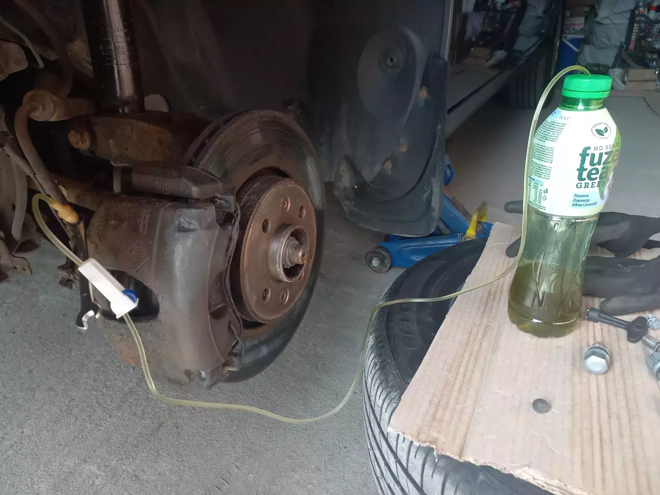 Шприц в мене вже валявся в гаражі, тому його і використовував, але насправді такий великий об'єм не потрібен. Трохи відкачав з бачка у пляшку, долив до максимуму свіжу рідину і можна переходити до коліс.