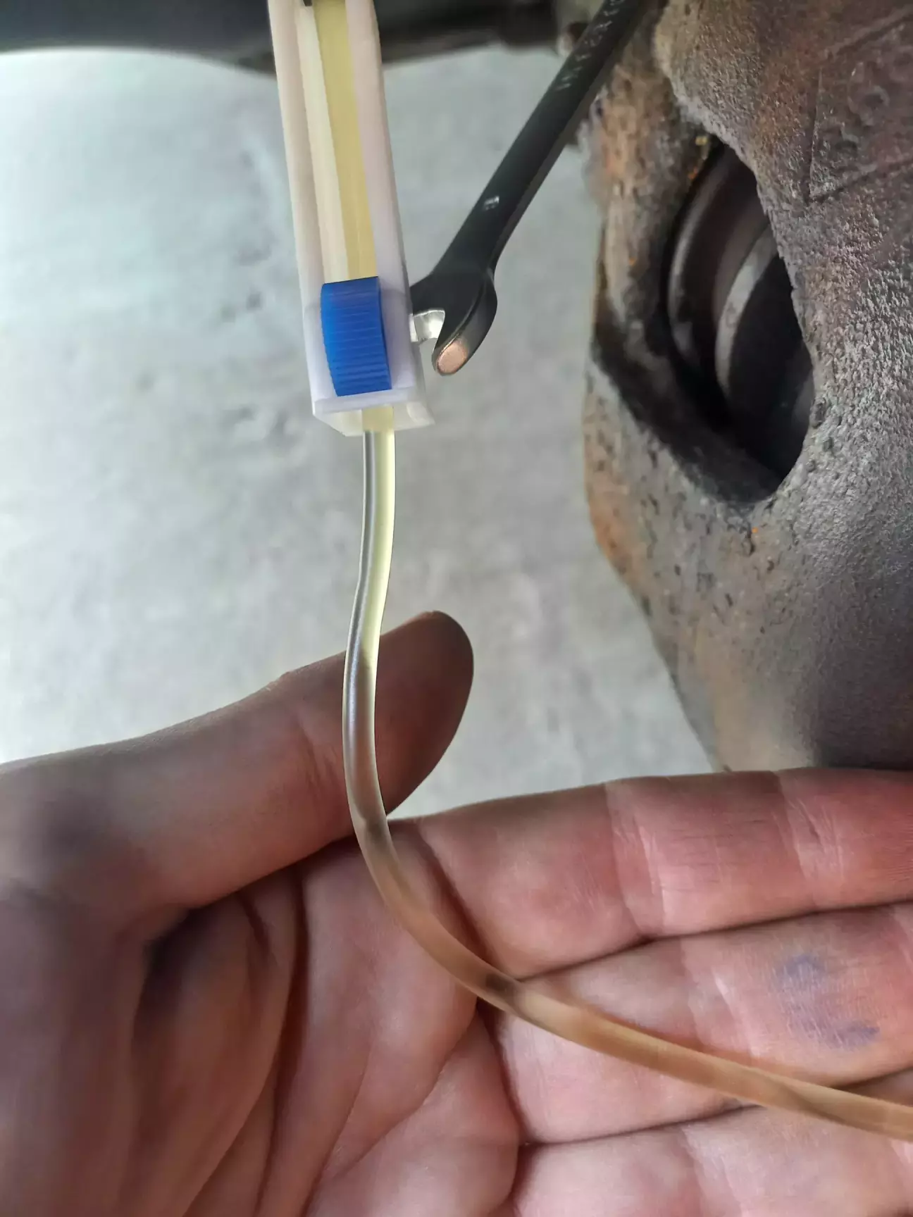 Основний нюанс з яком стикнувся - це те, що на відміну від туторіалів в інтернеті, в мене не було чорної жижи замість якої починала текти прозора, що свідчило про витіснення старої рідини свіжою. В мене як текла прозора як сльоза, так і продовжувала текти )) Тому довелось якось на око відміряти з урахуванням того, що на задні трохи більше треба, на передні трохи менше і щоб грам 150-200 ще залишилось.