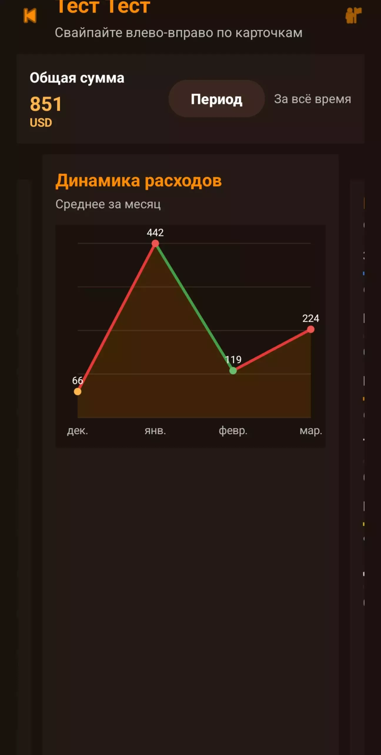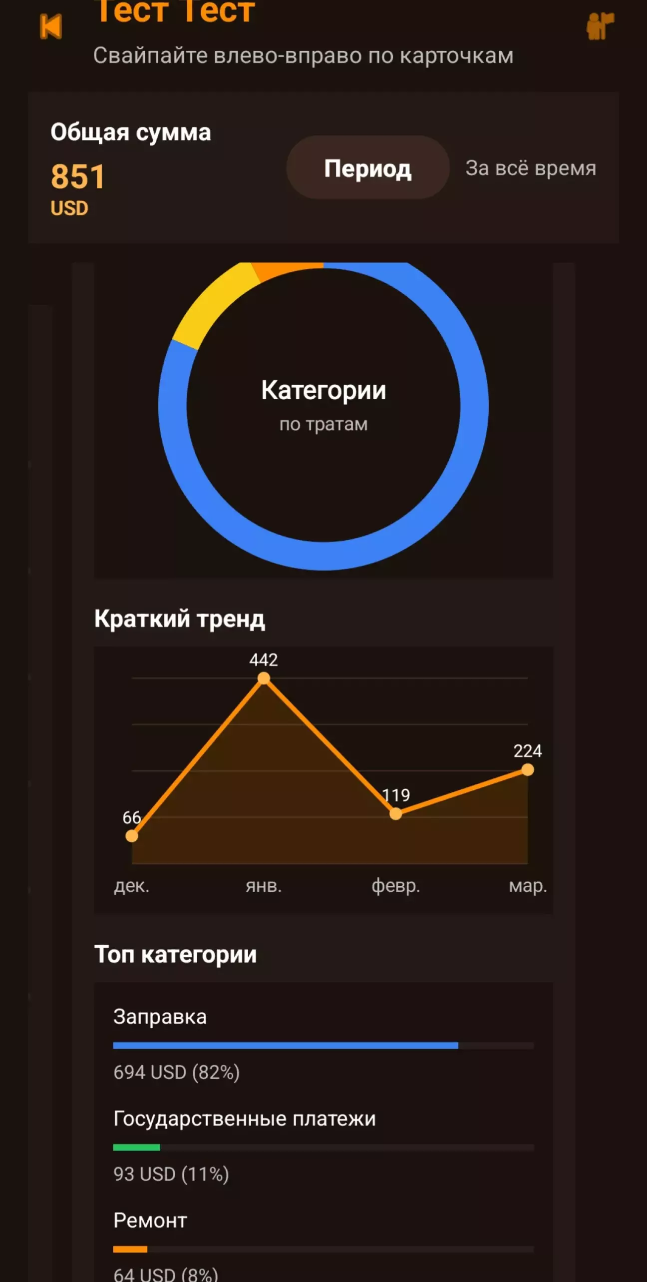 На старте больше всего упор делал на графики и аналитику. Хотелось не просто записывать расходы, а чтобы было интересно смотреть: какие-то показатели, зависимости, цифры, которые реально дают понимание, а не просто лежат списком.