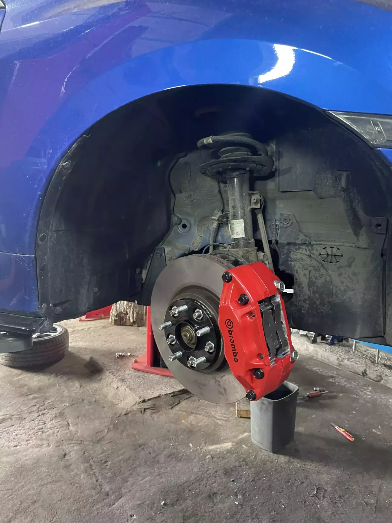 Зразу поміняв болти які тримають направляючі колодок в супорті і там де не хватало одного вуха вирізали його з 2мм нержавій, сточили до 1.5 і приварили. Тому варіант від субару не ставив, так як вийшло все супер.