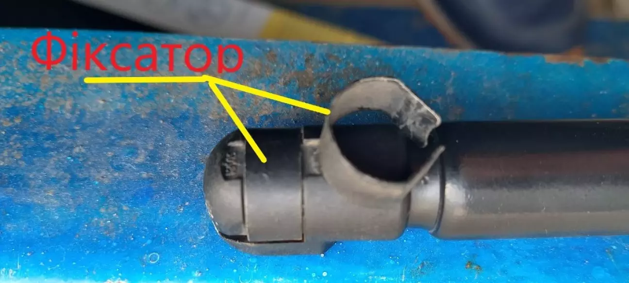 Шліцевою тонкою викруткою трошки піддіваємо фіксатор (повністю його знімати не потрібно ) і відводимо один кінець амортизатору, далі наступний.