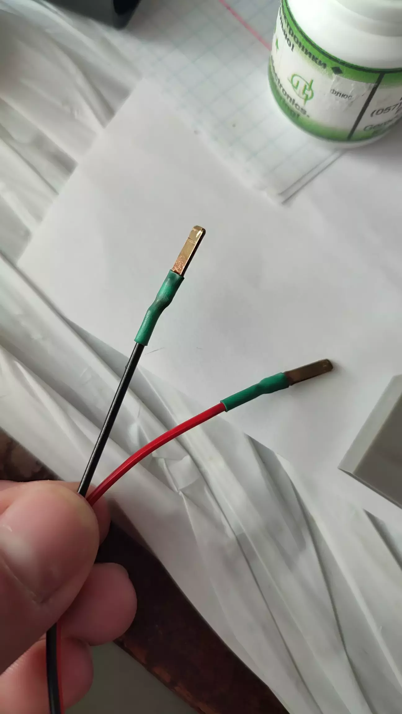 Попередньо дроти від плати було під'єднано до патрона лампи підсвітки попільнички. Розібрали "патрон" лампочки, зачистили металеві пластинки, залудили припоєм і припаяли до них дроти. Вставили назад контакти (плюс має бути коло фіксатора роз'єма).