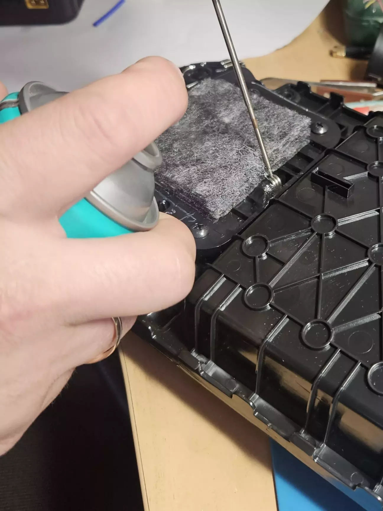 4. В мене під рукою був двохкомпонентний клей Адфікс. Тому спочатку склеюю і далі запшикую аерозолем. Тримається все міцно і виглядає надійно. А головне працює)