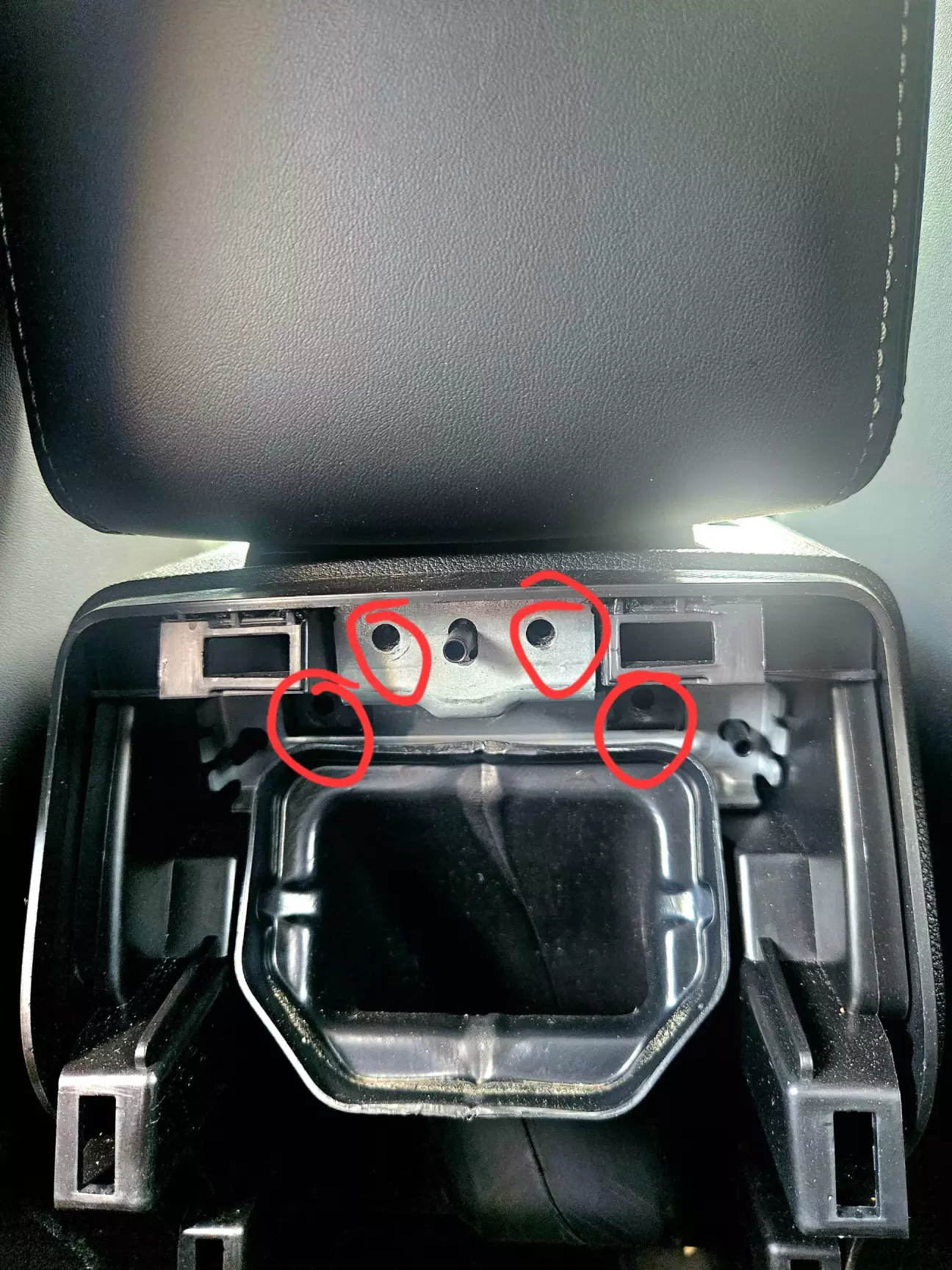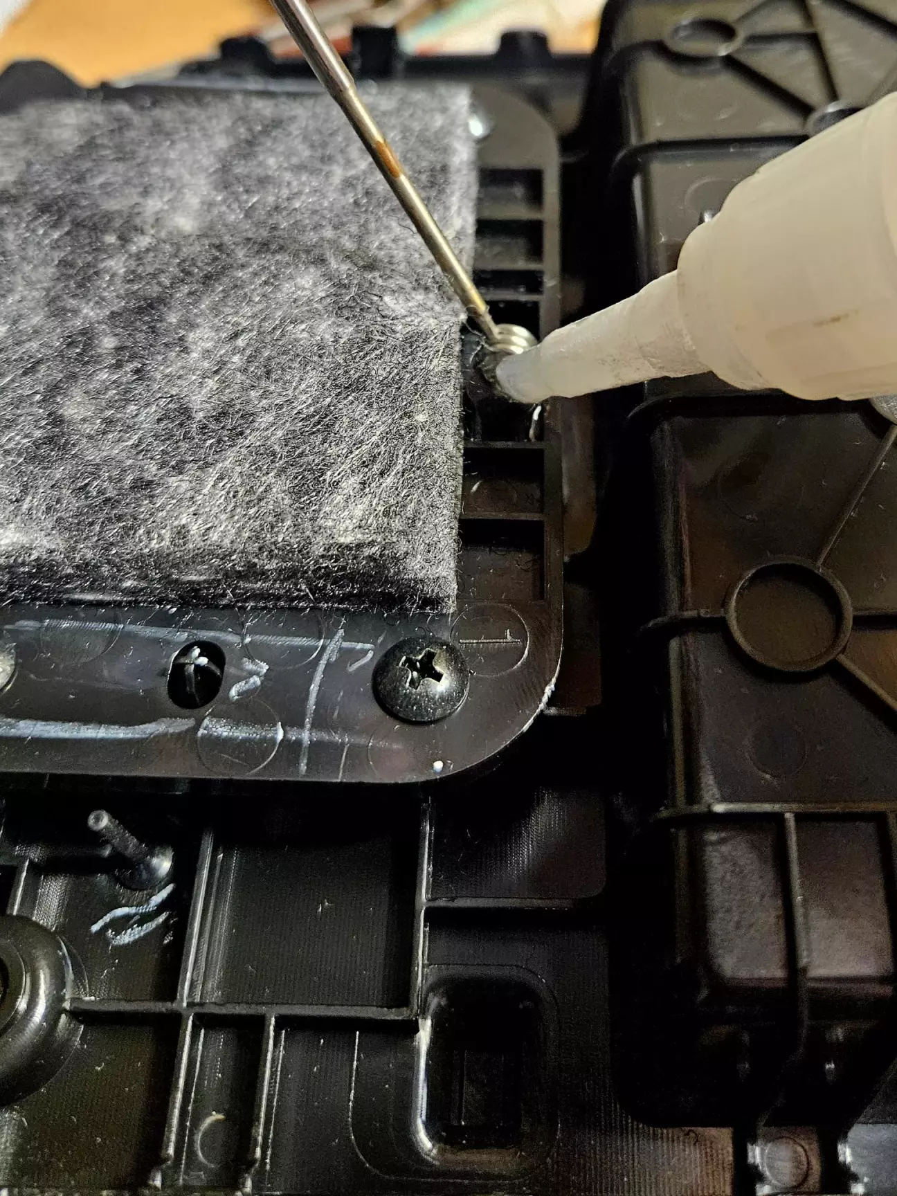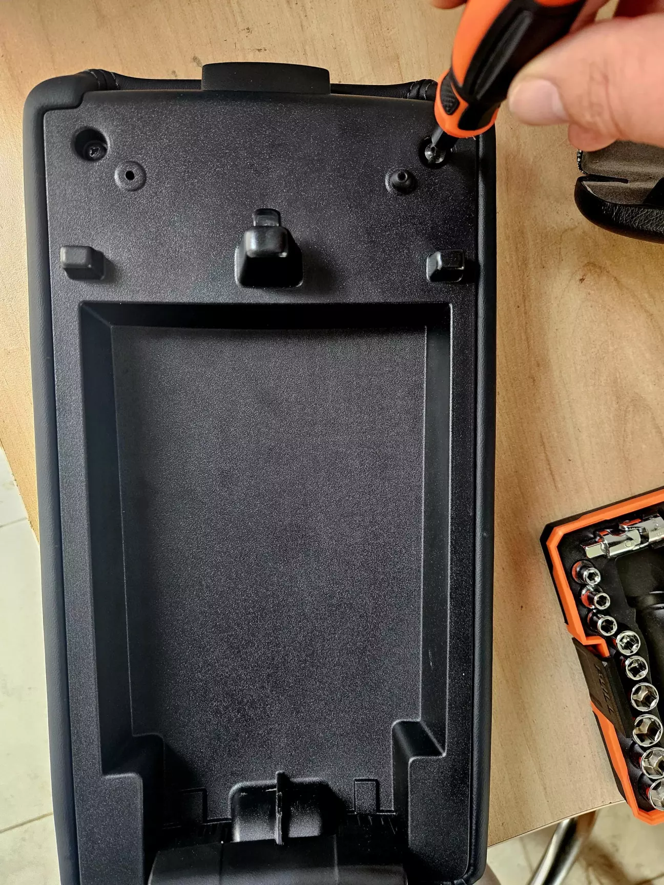 Несемо це добро у більш комфортні умови і беремось розбирати сам підлокітник. Спочатку потрібно викрутити ще 2 саморіза і потім відділити кришку з шкірою від корпуса з допомогою пластикового інструменту. Робиться це з певним зусиллям.