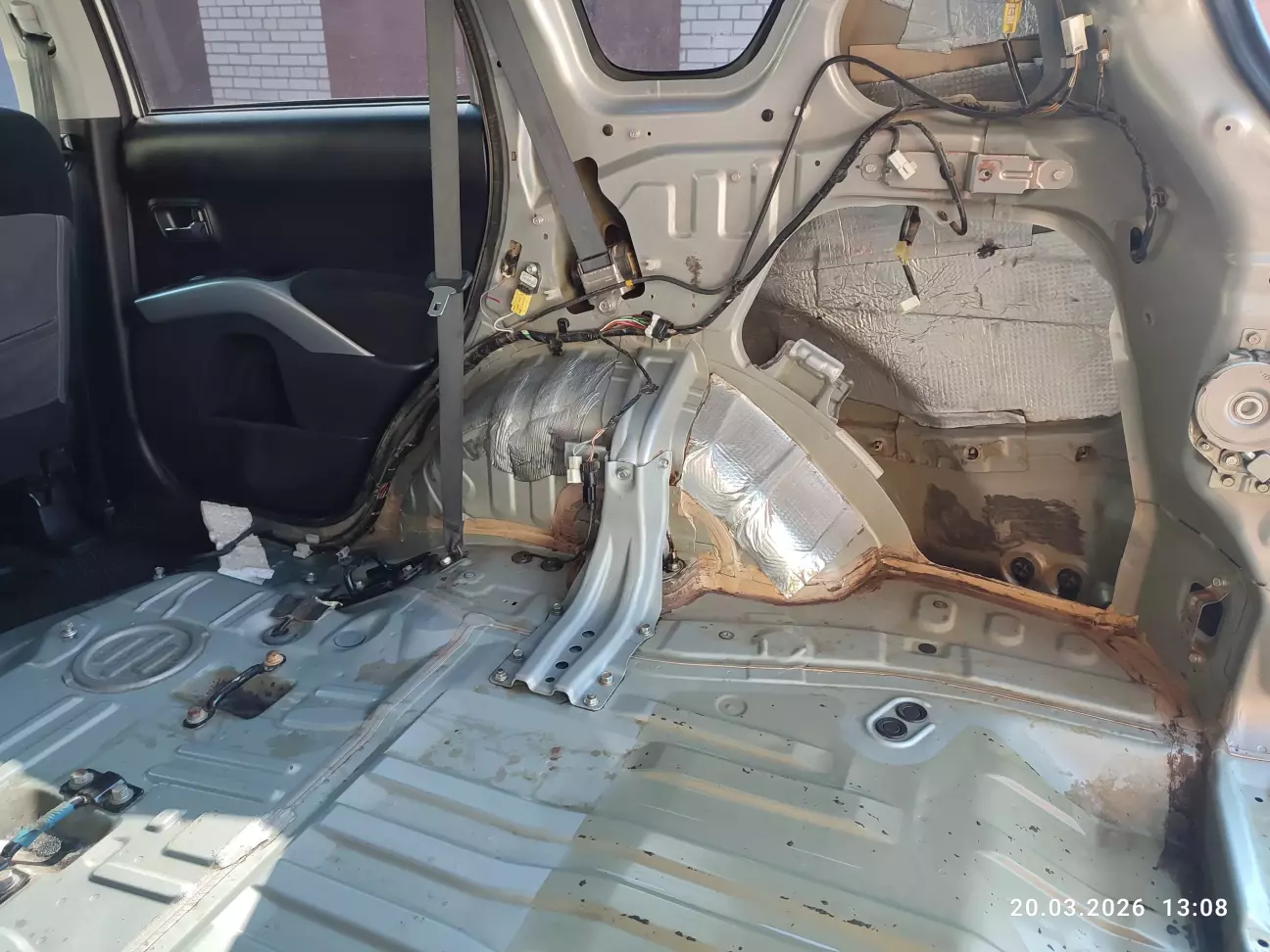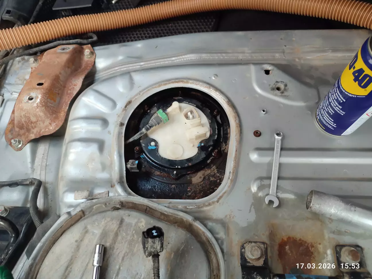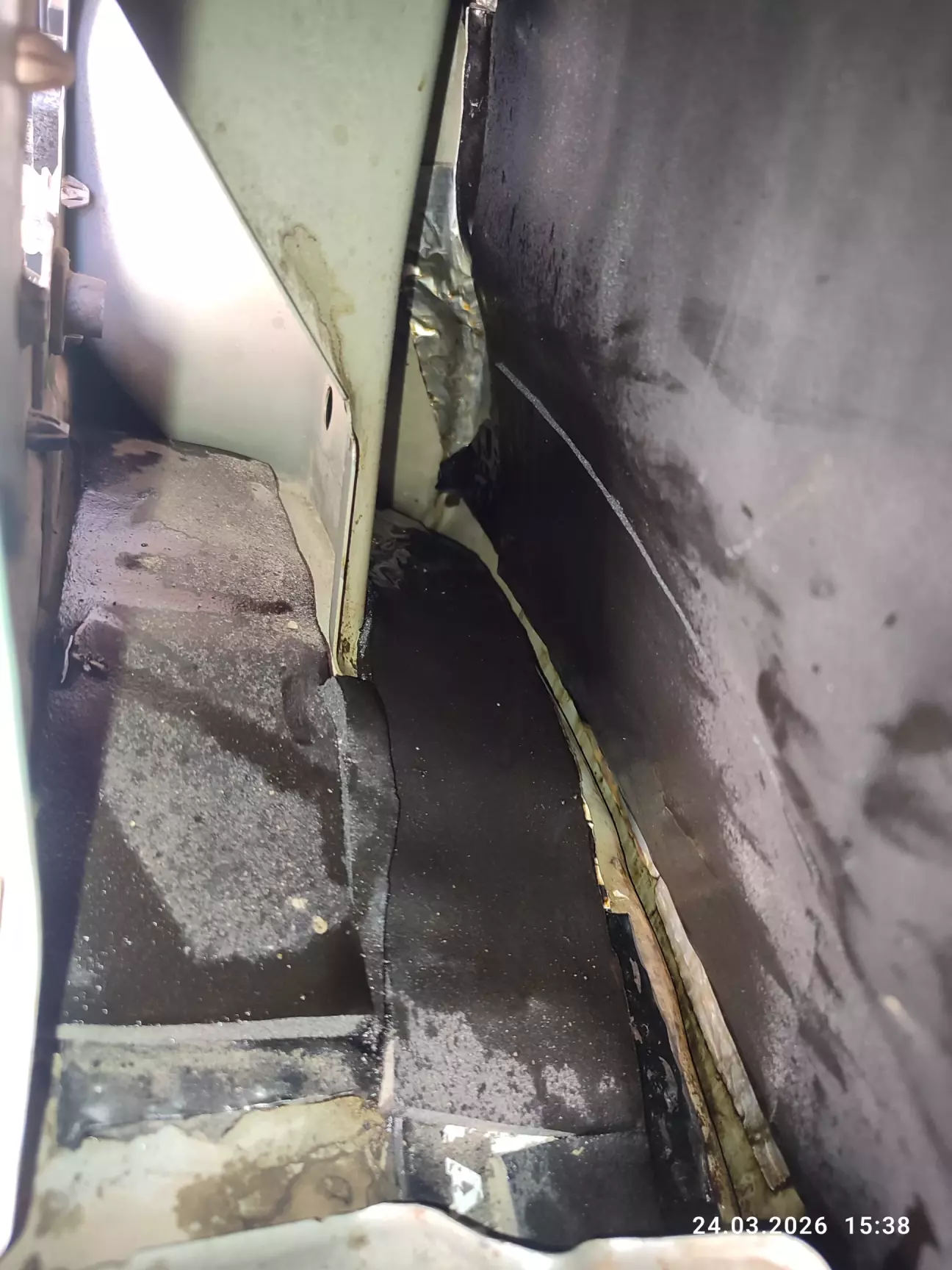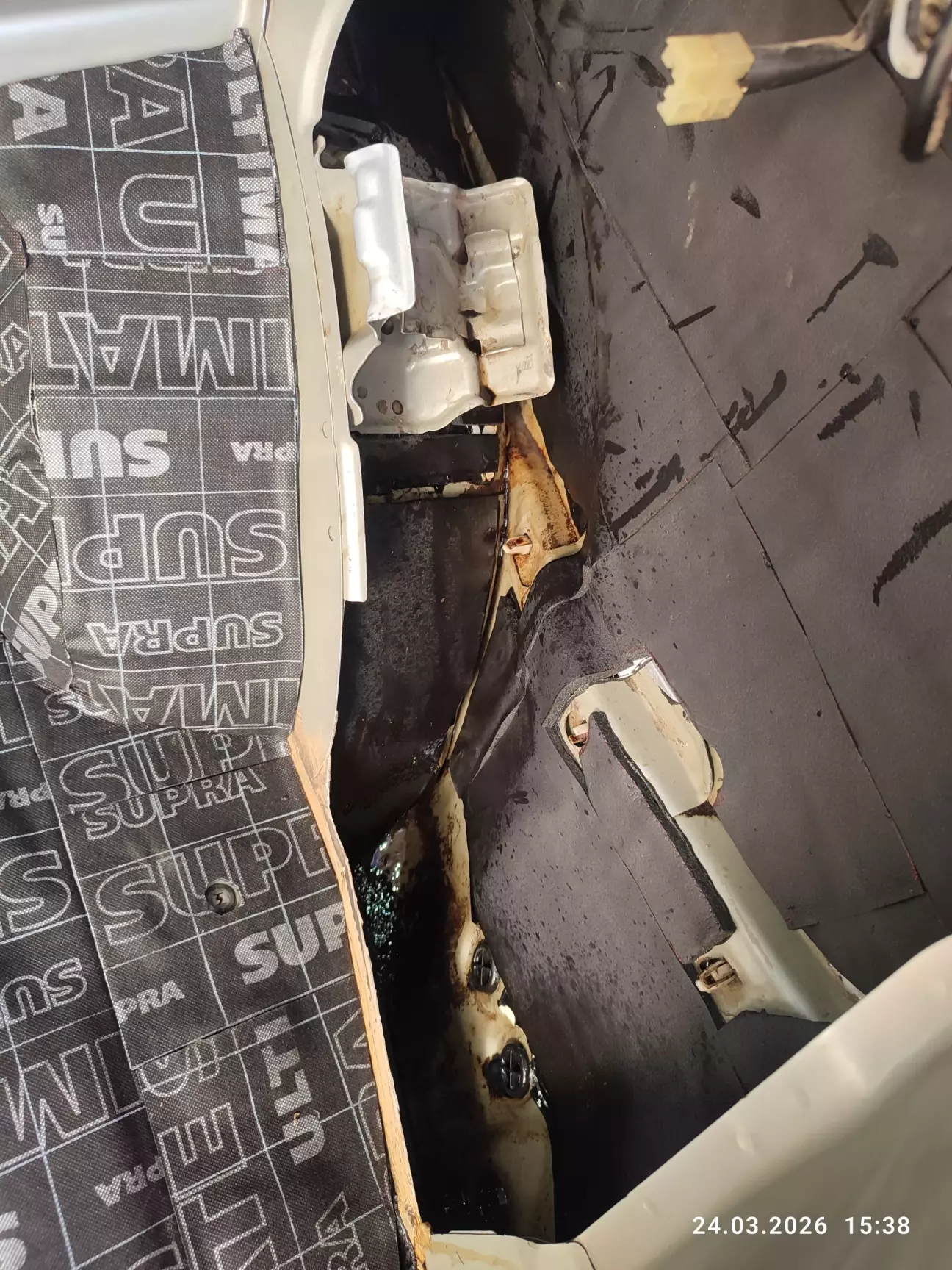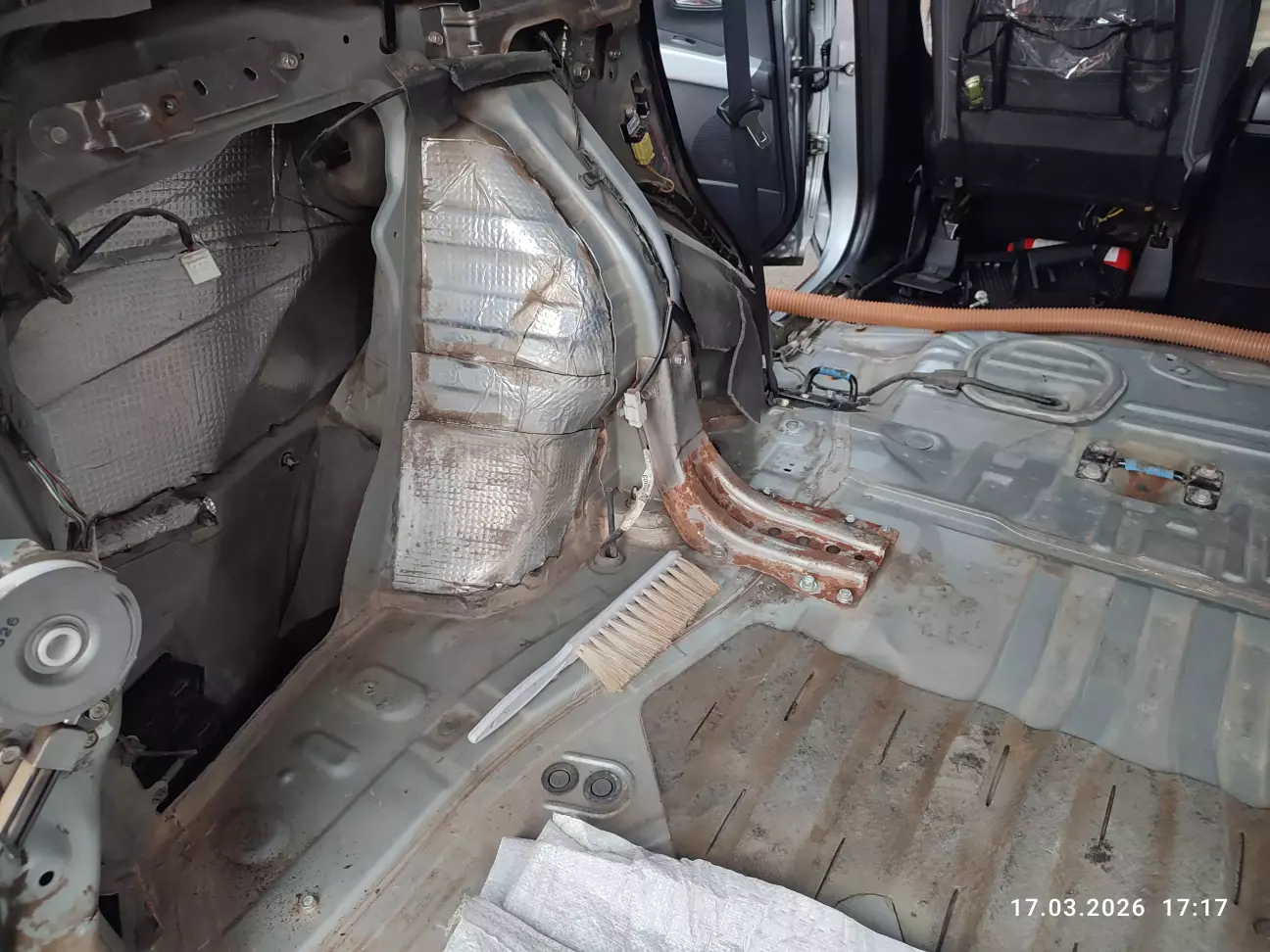 Спочатку, вирішив зняти лише по бокам чорний пластик та задерти ковролін до відкинутих сідушок, і на цьому достатньо для підходу окремим розпилювачем від пневмопістолета. Після даного этапу звичайно глянув до кришки паливної колби, по стану зрозуміло що там ще нікого небуло (за 18 років), колба ще стоїть заводська, але 6 шпильок паливного баку на М5 закисші іржою наглухо. Зрозумів що негайно потрібно їх спробувати рятувати, бо ці шпильки лопають на раз два при демонтажі прижимної пластини колби і потім з'являються великі об'ємні проблеми з отвором паливного баку (заміна паливного баку). Для реставрації шпильок підхід дуже незручний, демонтую повністю другий ряд сідушок та витягую ковролін та заводську шумку з войлока.