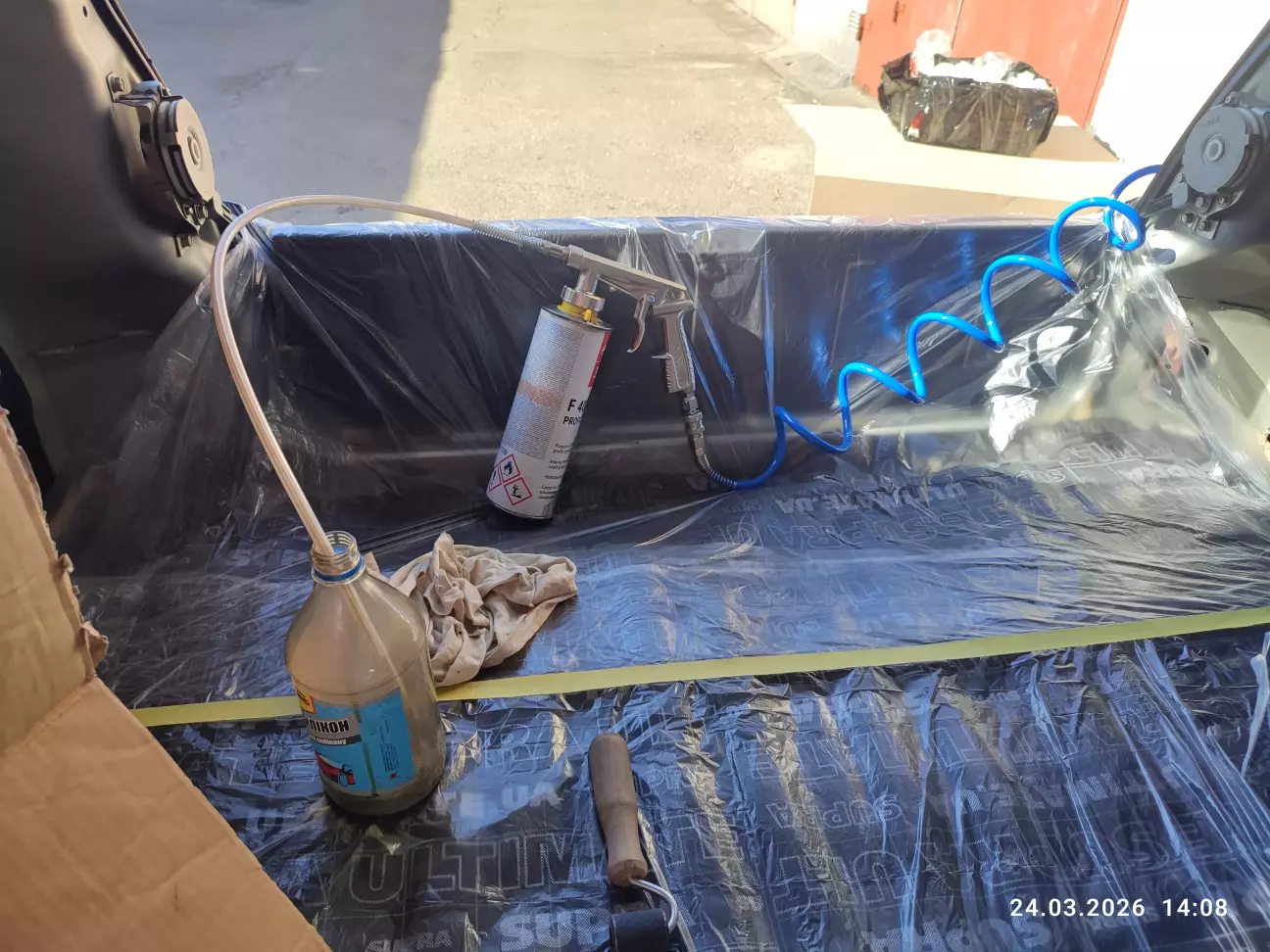 Так як антикор жирний та на восковій основі мусив першу чергу проклеїти вібру та антишум, а після фінішу аплікаційних робіт обробити всі приховані порожнини другої частини авто.