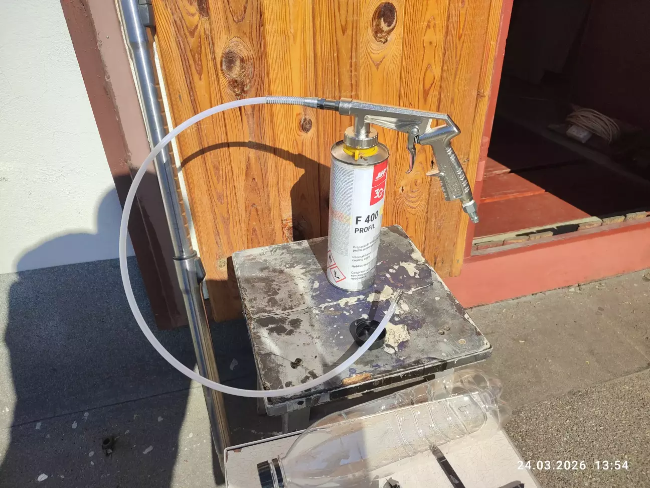 Але форсунка під тиском повітря так дубасить що ця рідина антикору на вихід перетворювалась дуже густий туман і з інших отворів виходив важкий сизий пар антикору. На запах як для мене специфічно приємний не ядючий.