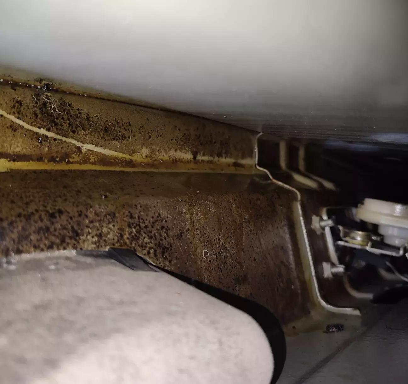 Ще пару фото зробив після більше 4-ри річної давнини з нижніх частинах 5-ї Двері де полюбляють збираються рижики від вологи з пилом (аналогічно в такому стані в інших 4-х дверях де оброблялось спец., антикором Noxudol). В такому стані воно і залишилося по сьогодення свіжа жирна волога воскова плівка. Ледь просунув телефон в технічні отвори щоб трішки показати на фото.