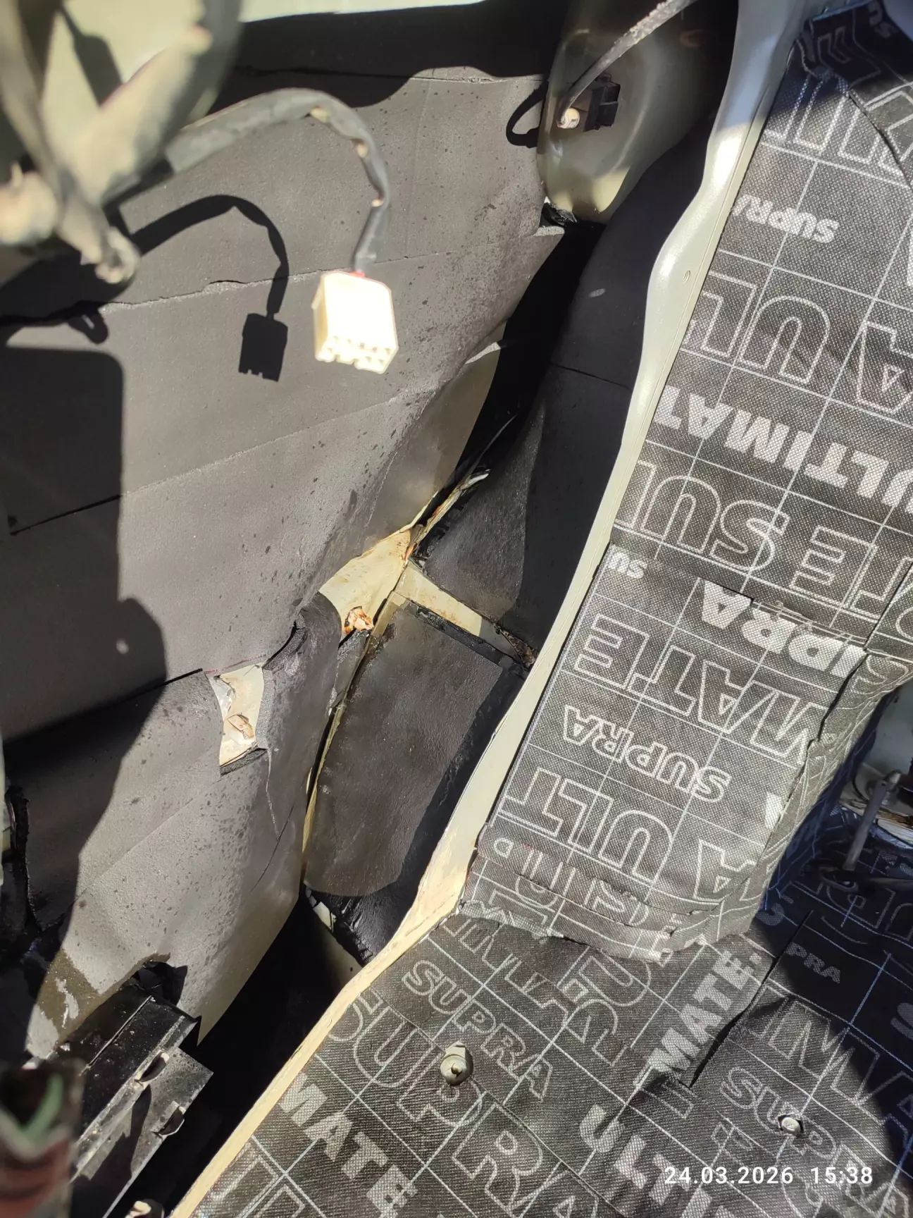 На фото видно А-ЛЯ проклеїна вібра, лише на фільонці стінок кузова, частково на задніх арках та в середині на фільонці дверей, я рахую краще б не лізли але що маємо то маємо і це я бачив знаю, але толку від неї повний нуль. Вібра похоже товщиною на 1~2мм. Зазначу на рахунок шумки навіть ні трохи не міркував до цього, стояла задача обробити повністю ці негаразди навіть в тих місцях де внутрішні полостя ніколи не бачать денного світла.