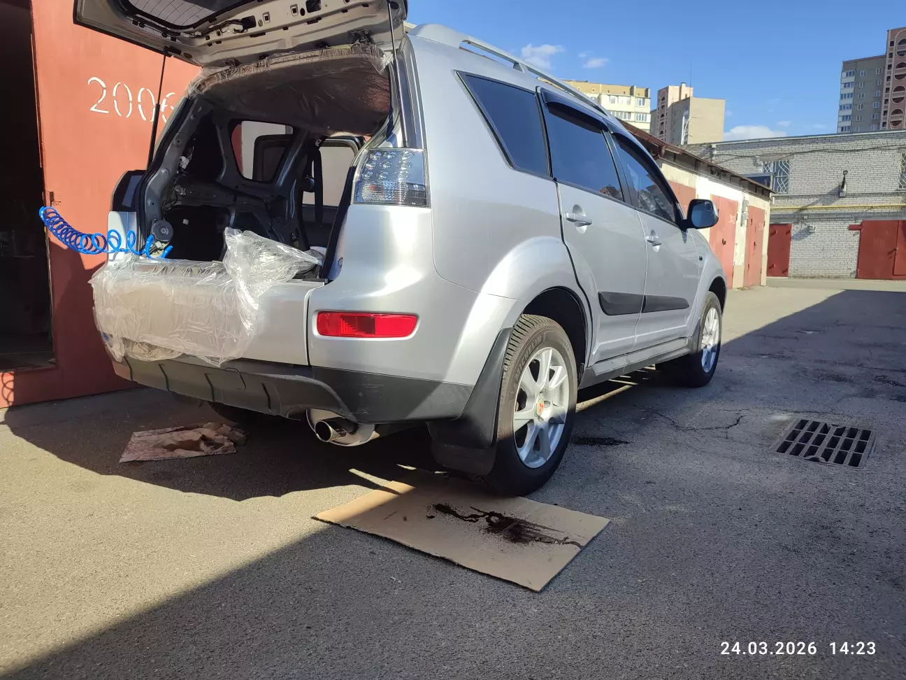 Перед обробкою внутрішніх порожніх ніш різних закаулок за/перед колесними задніми арками різних порожнеч, потрібно максимально захистити обшивку даху. А то якщо не дай бог цвіркне, -.... це все, видалити нереально! Загалом все успішно.