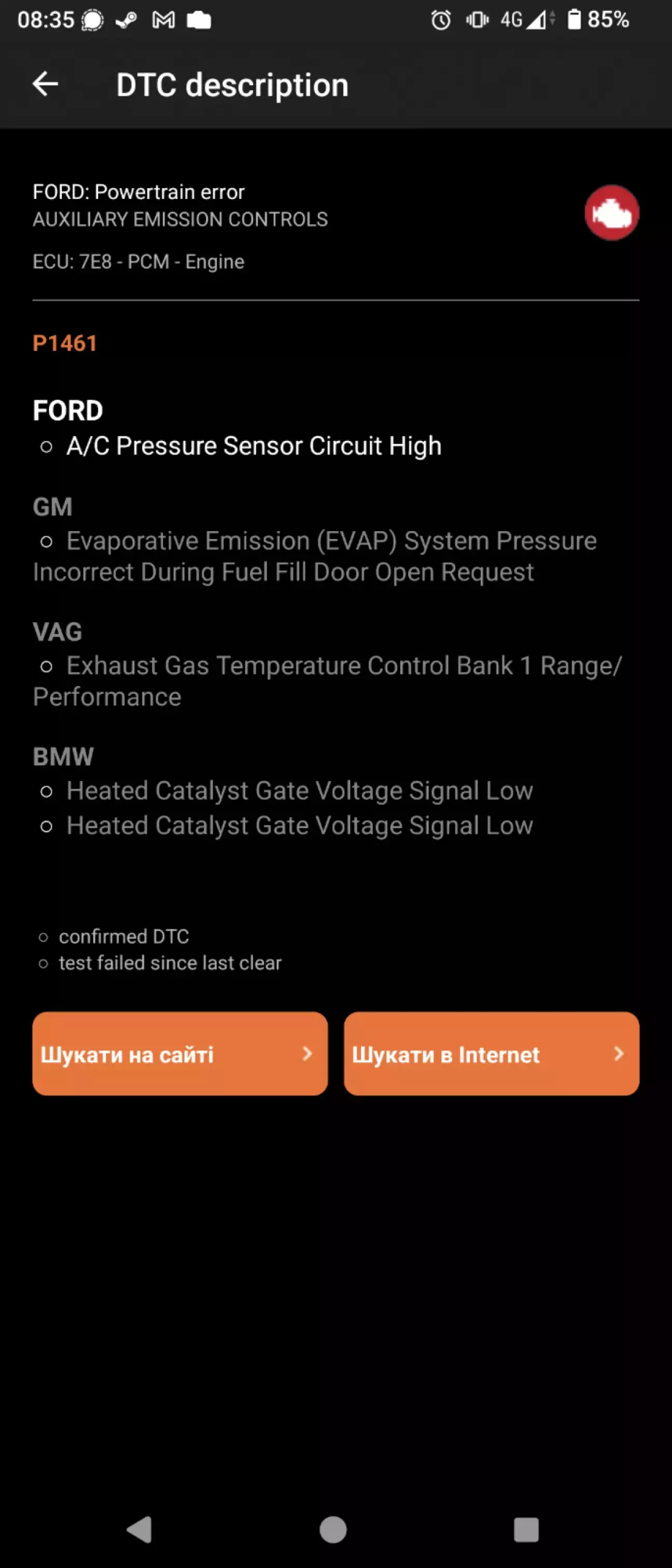 Було багато пошуків впродовж декількох тижні щодо природи прроблеми, поки не наштовхнувся на очевидне: прочитати авто по системі кондиціонера своїм сканером (коли читали на сервісі, то помилок той сканер не побачив). Використовую "FORScanLite" і адаптер "Vlinker FD" - і бінго "помилка P1461" - високий рівень сигналу датчика тиску кондиціонера - показник тиску гуляв в районі 30-31 бар (при нормі 6 бар на холосту і в районі 12 бар під час роботи).