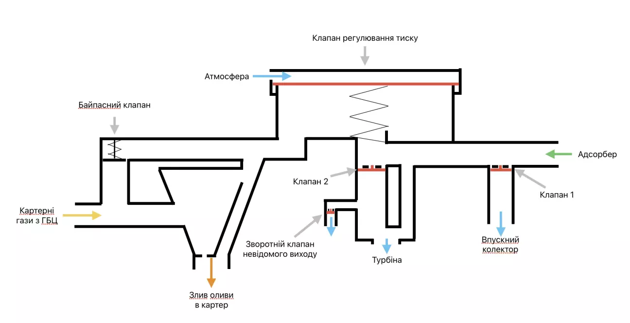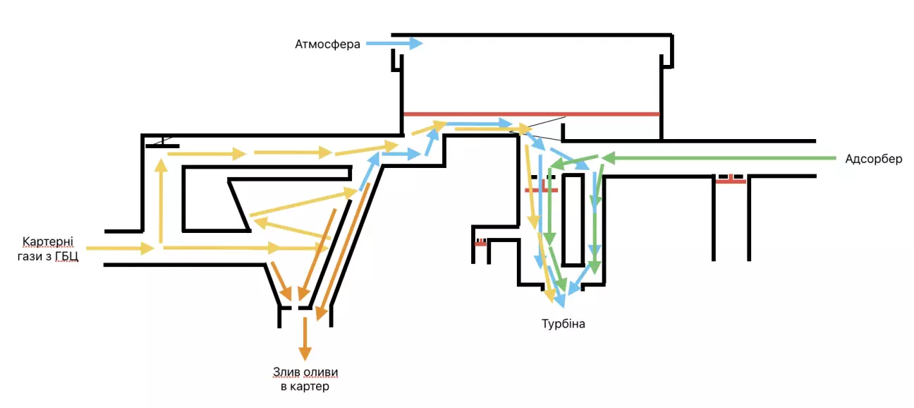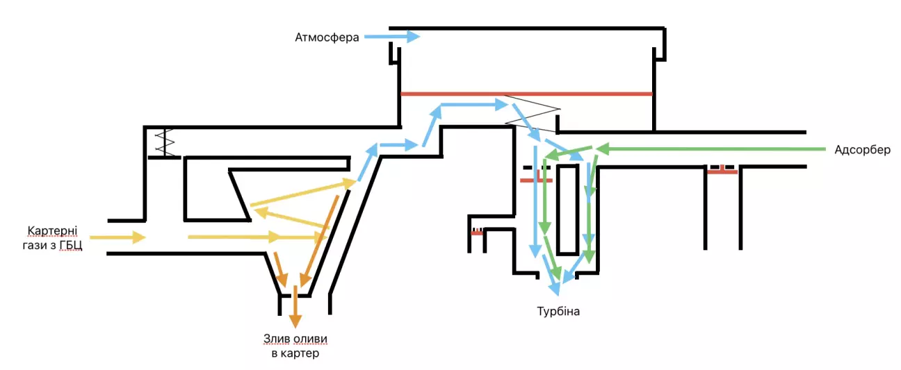 Конструктивні особливості системи вказують на те, що на високих обертах олива неминуче потраплятиме у впуск перед турбіною. Це стається через те, що потік газів спрямовується в обхід циклонного фільтра, і навіть штатний лабіринт не здатний його повністю відфільтрувати від оливи.