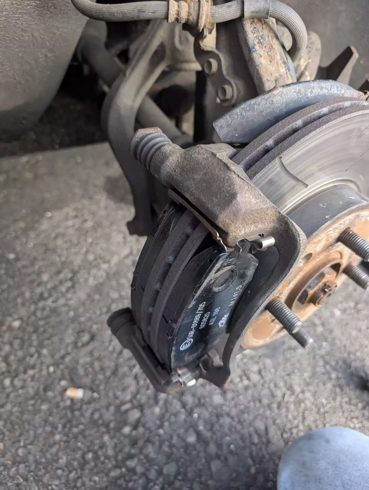 Сидя в непонимании как так то без суппорта идёт как по маслу пальчиками весь болт закручиваю а с супортом треш, решил поставит одну старую колодку - все вкрутилось, значит дело не с суппортом и резьбой, приглянулся к колодке и смотрю что по одной стороне колодки супорт оставил царапины видно колодка криво стоит, сравнил колодки может брак, но тут я увидел буквально краем глаза что у меня не равномерно износился диск и на нем есть искривление, выглядит так будто колодка никогда и не касалась этого места. Нужно точить новую колодку, нождачки нет, отвёртка просто уничтожит колодку но есть же асфальт))))