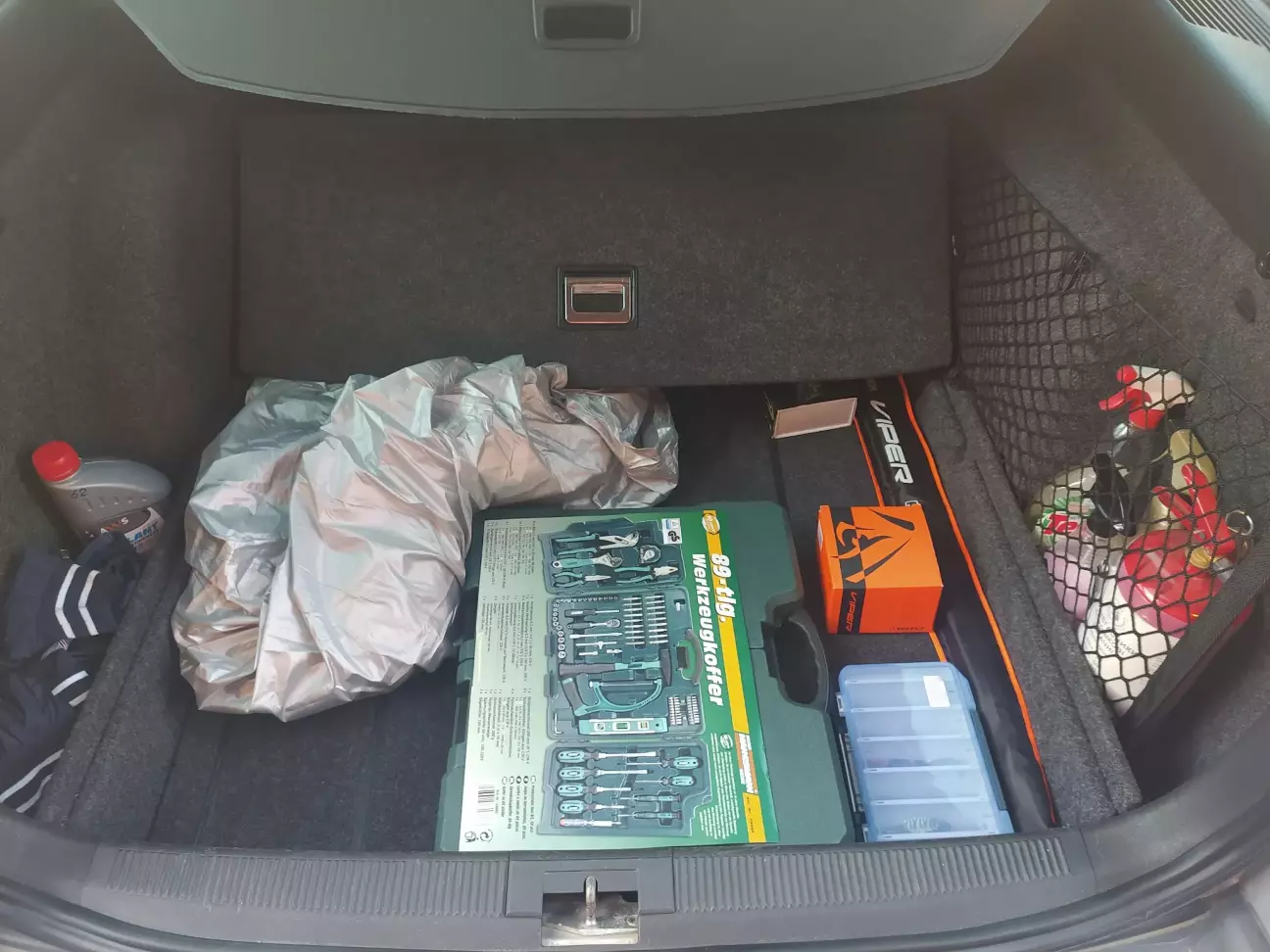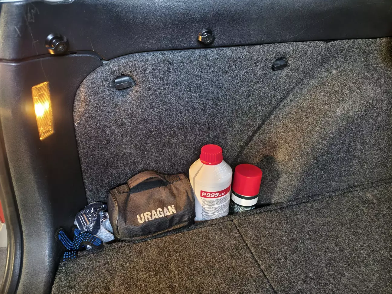 Трохи хаос, бокові ніші зайняті різним корисним. Зліва маю компресор, антифриз на доливку, WD. З правої сторони вогнегасник і різна автохімія. За ними є ще одна ніша, захована дверками з обшивкою багажника, які я майже ніколи не відкриваю, хіба що коли міняю лампочки задніх ліхтарів.