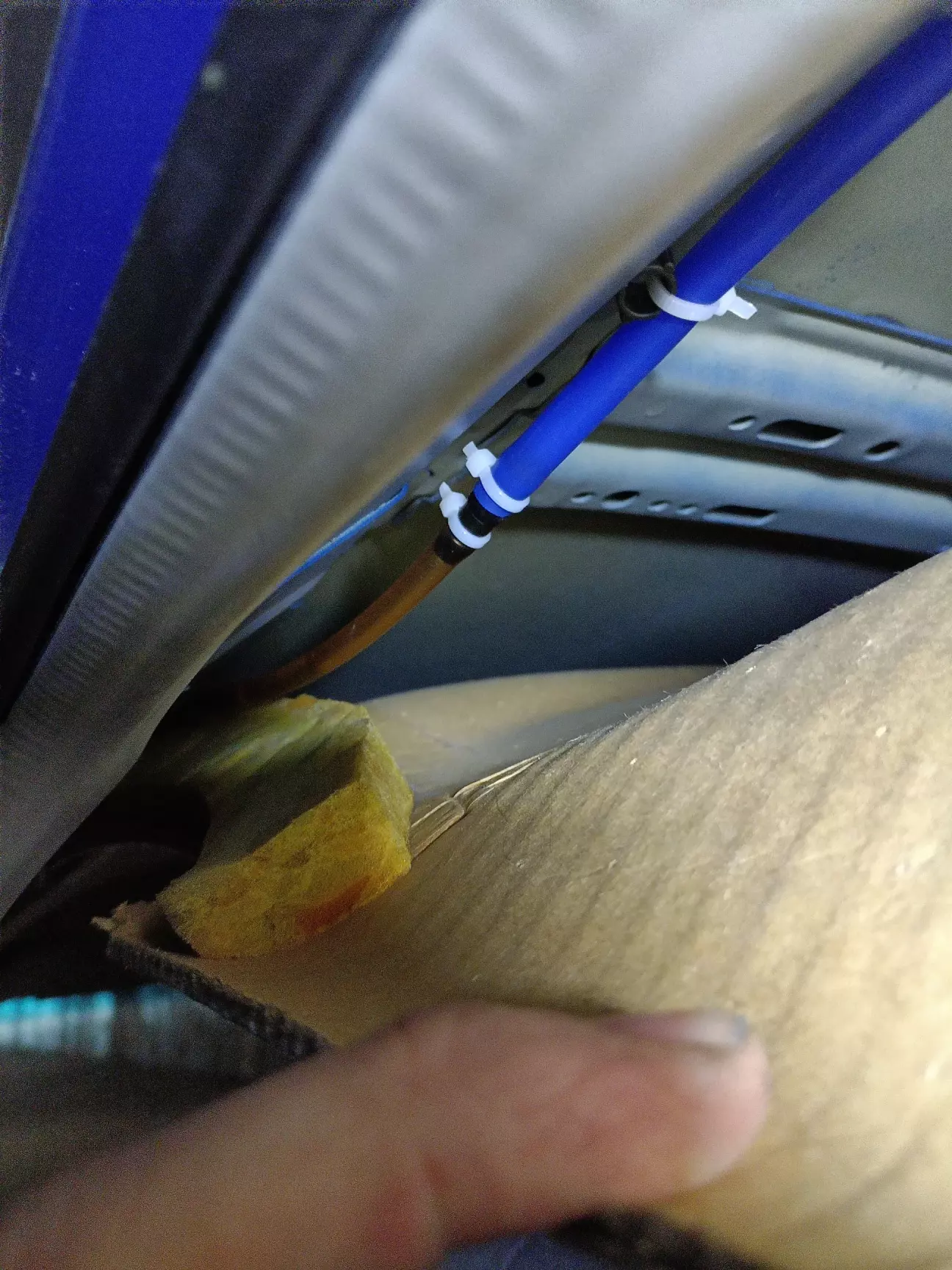 Приступаем к замене, удаляем старую трубку, в ляде просовываем проволоку сложенную вдвое (1,0-1,2 мм) от петель ляды в сторону стеклоочистителя, закрепляем на проволоке шлангочку, посыпаем ее тальком и аккуратно тянем и подаём, работаем двумя руками или вдвоем, тальк нужен для снижения трения. Для меня самым сложным оказались два места это прокладка в ляде и протяжка через гофру. В районе средней стойки есть соединитель шлангочку ,по потолку идут клипсы для шлангочки.