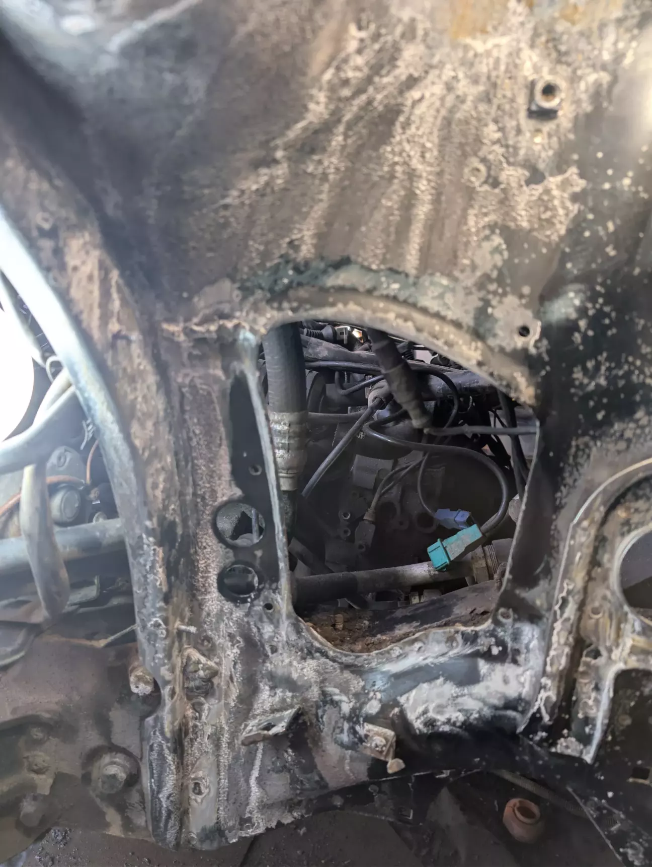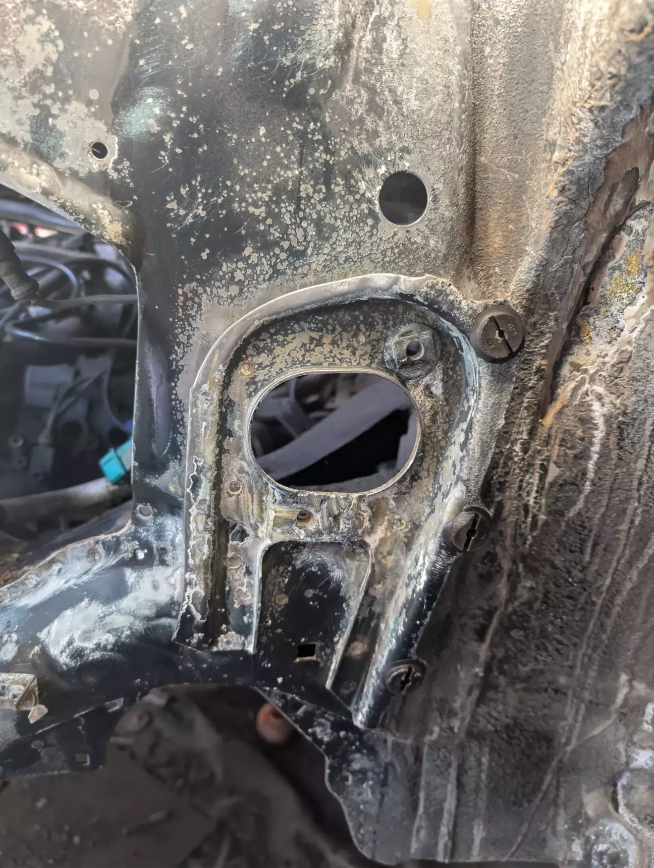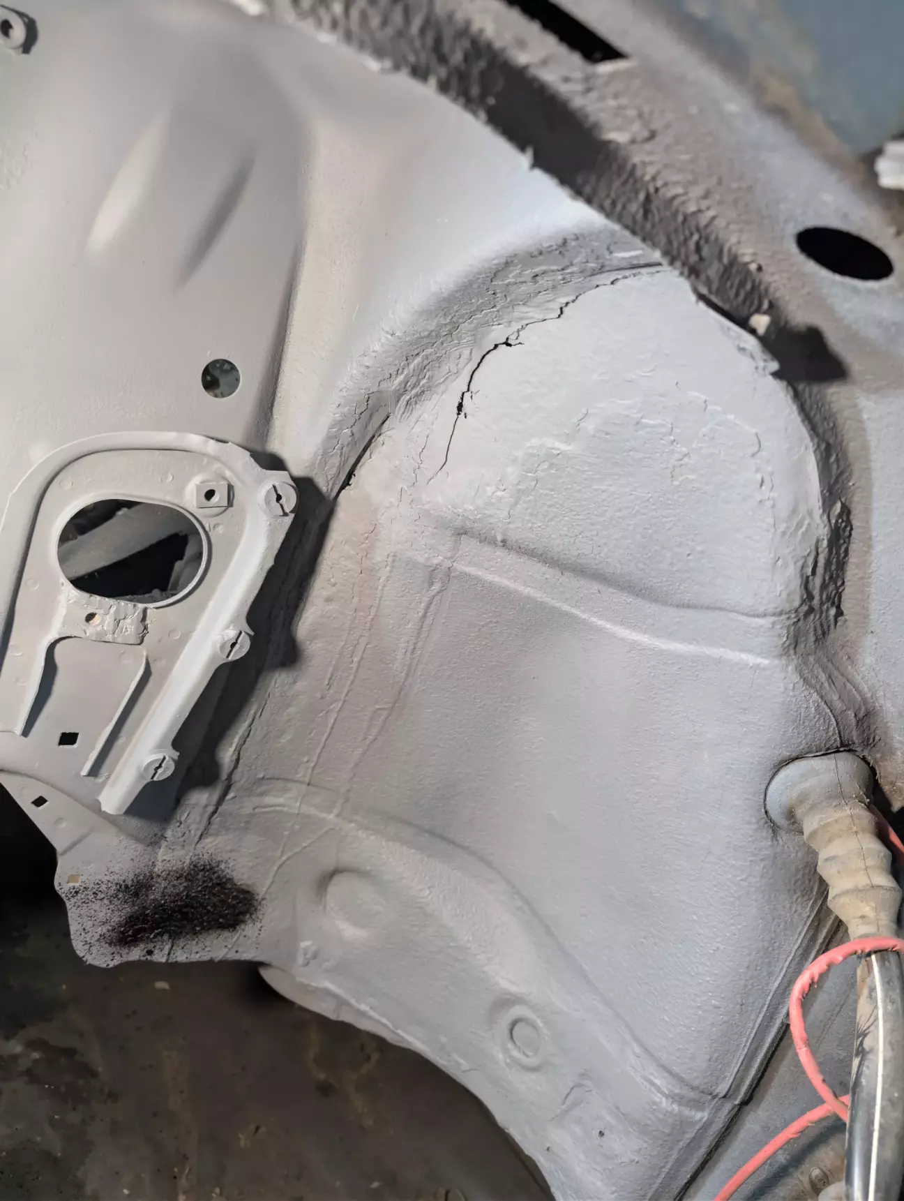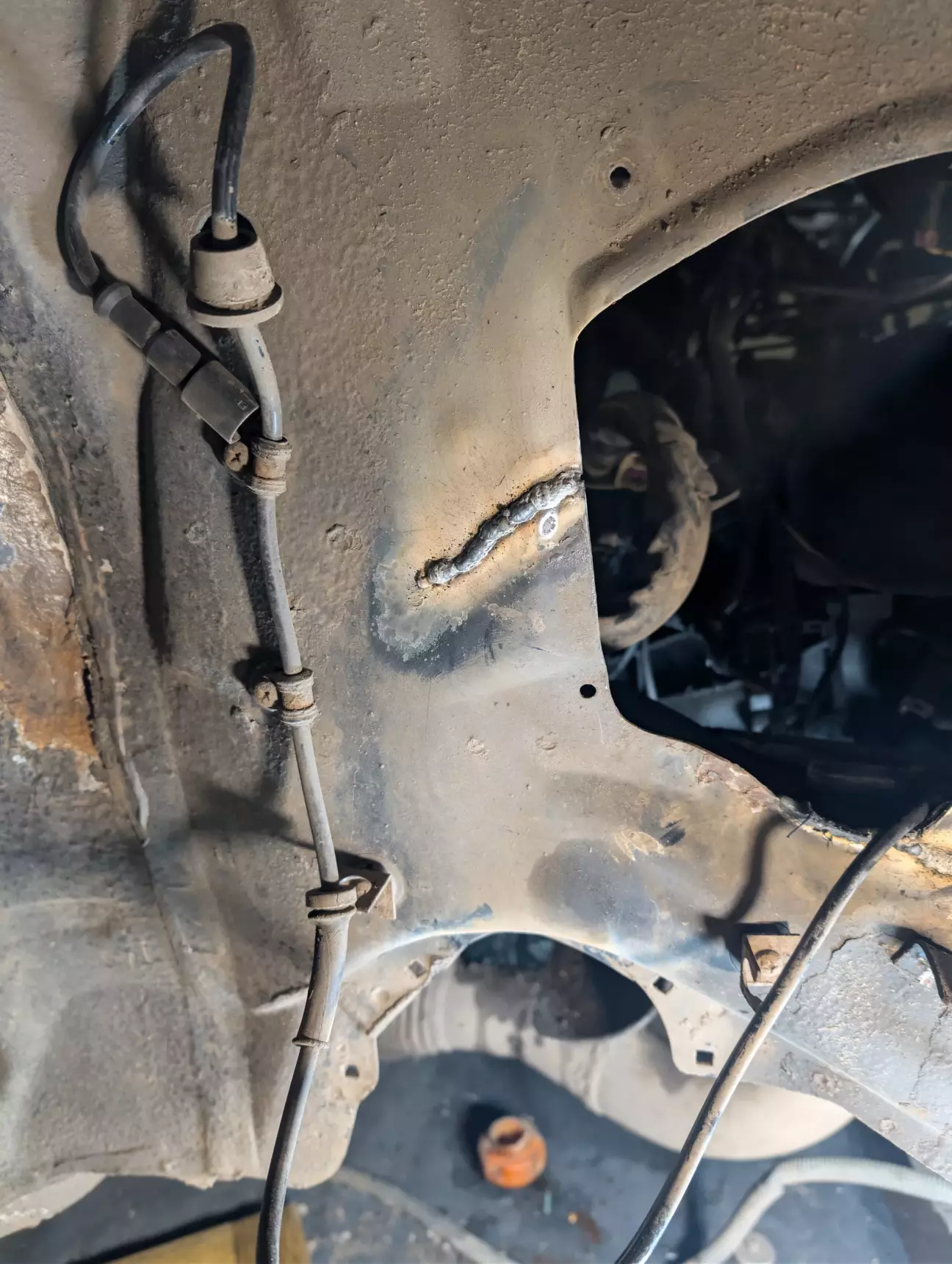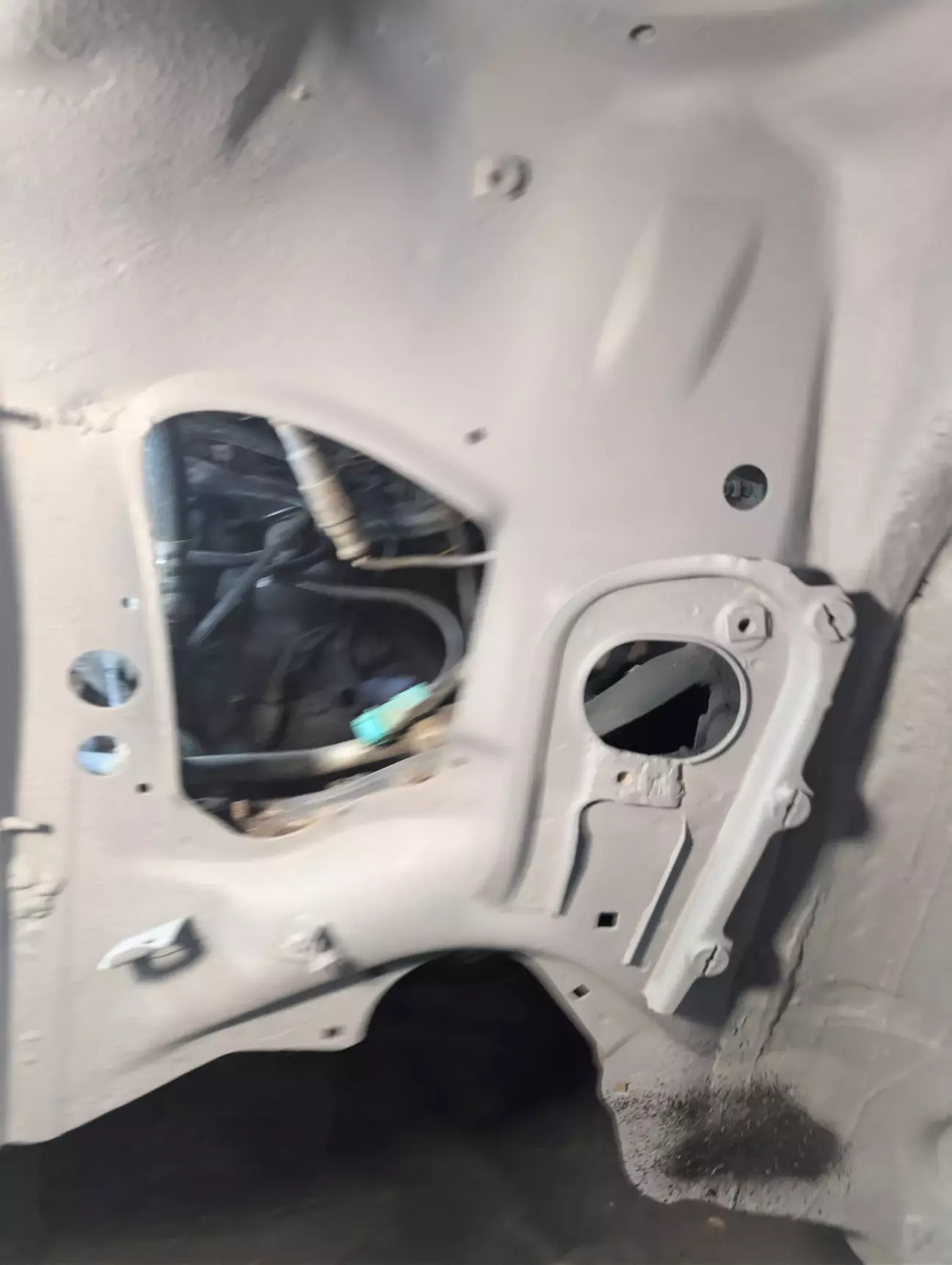 Це окрема історія. На даний момент робив лише підкрилки і лонжерони — саме ту частину, яка від моторного щита до бампера. Авто явно отримало або по морді, або в праве крило. Про це свідчать порвані частини, і порвані вони значно. Після того, як авто вдарили, його максимум потягли і зібрали, але не варили і не фарбували. З того, що було виявлено. На обох підкрилках, де отвір для рульових тяг, були надриви.