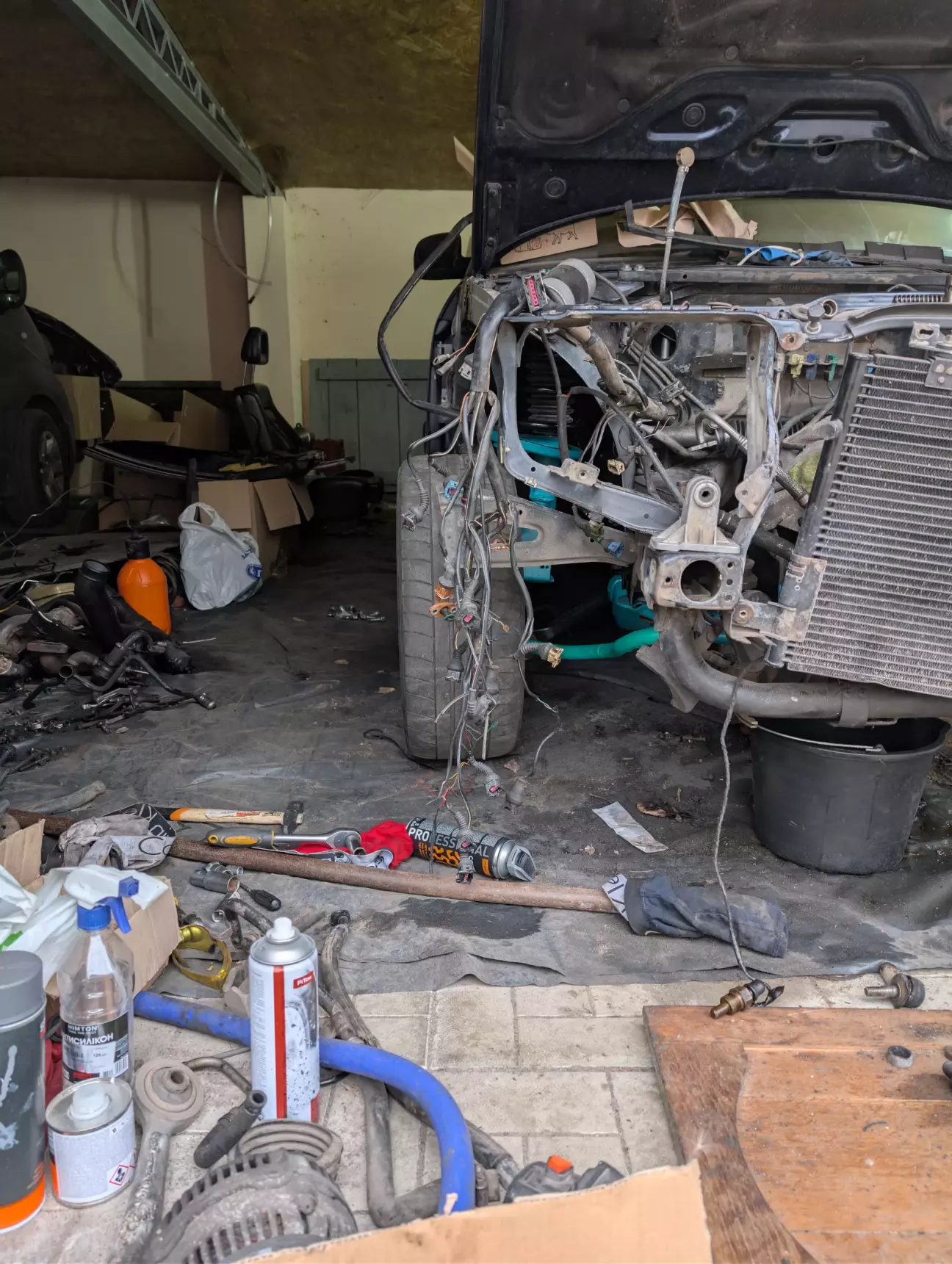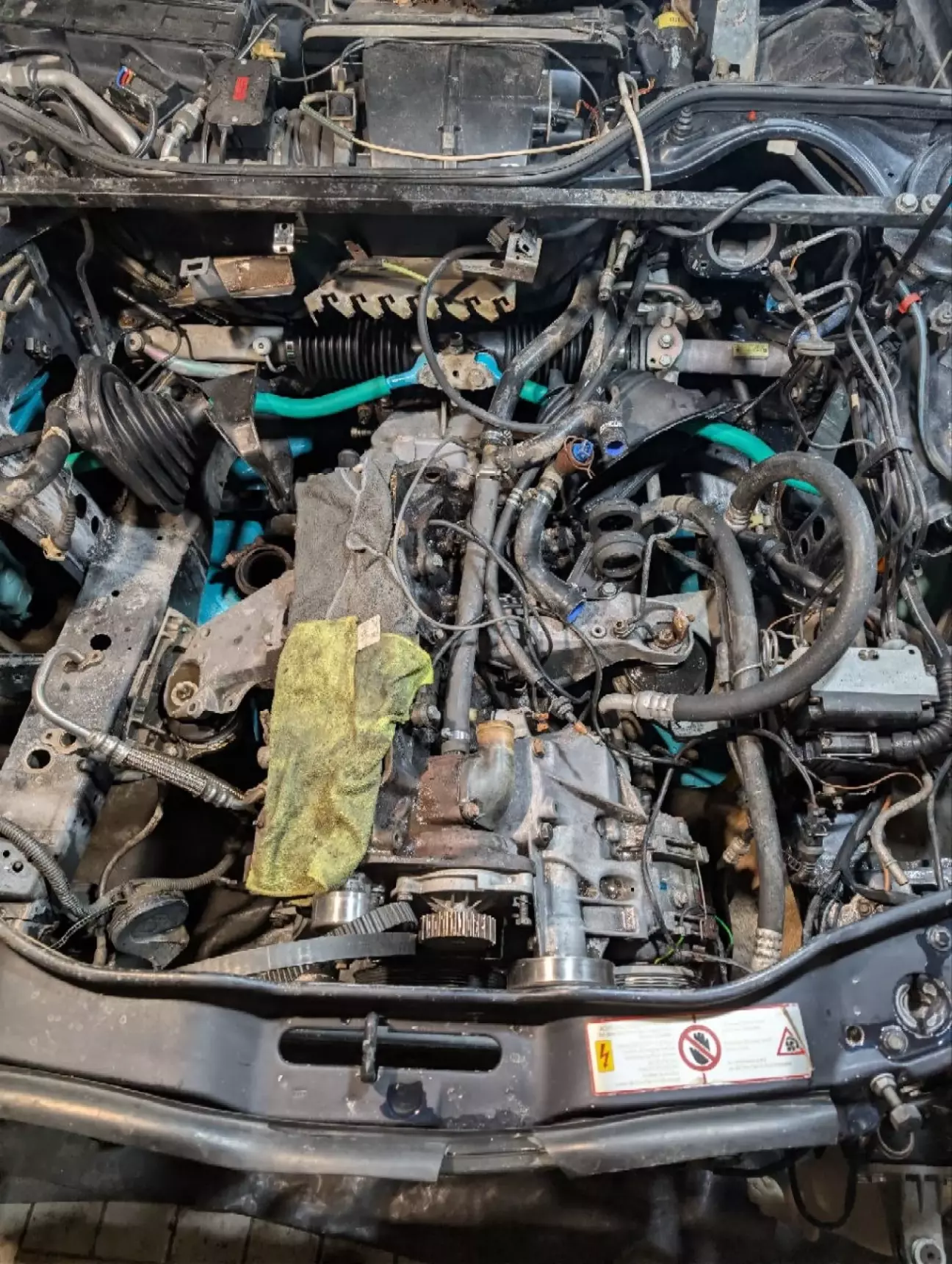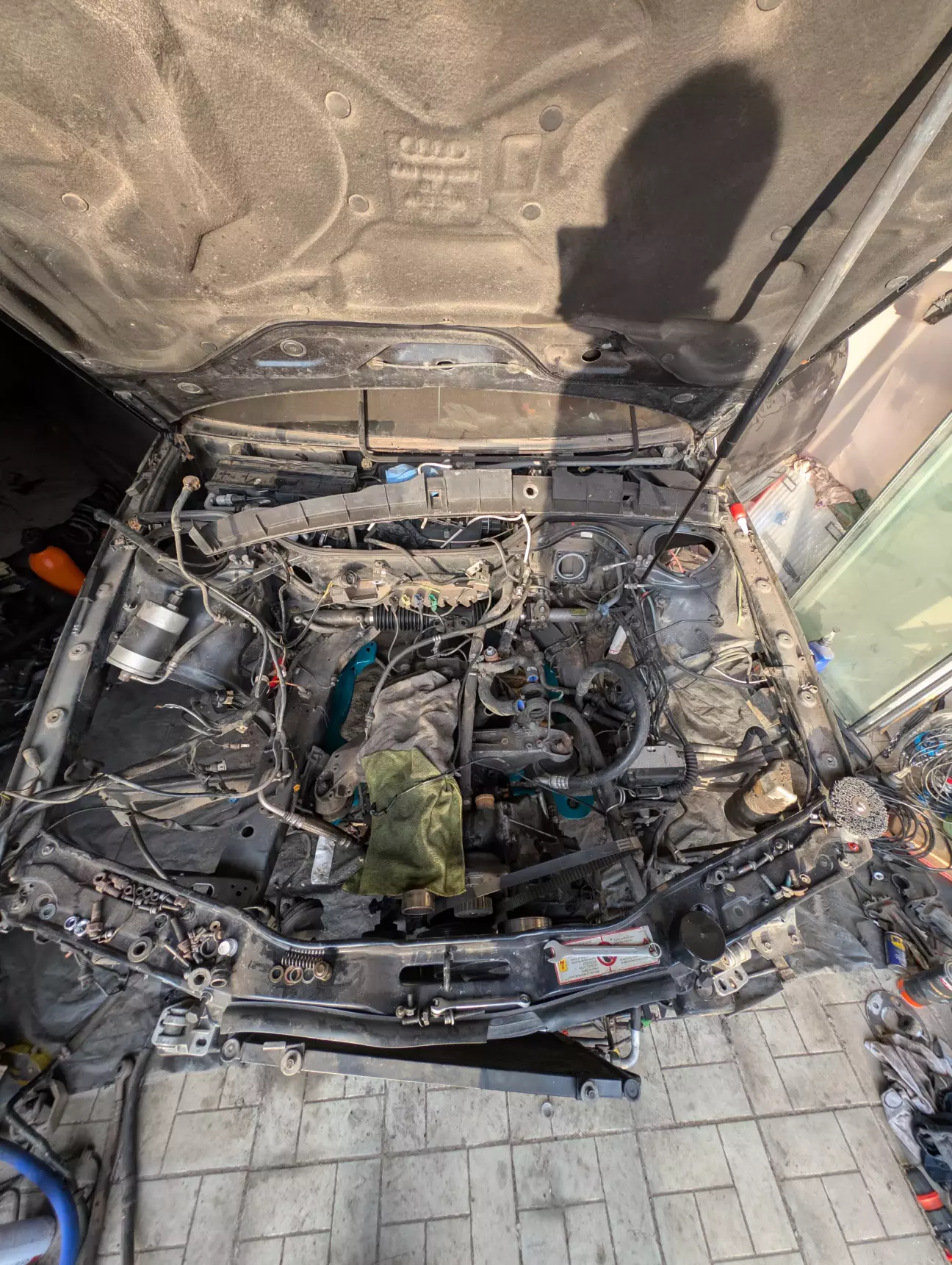 Авто вперше встало на всі 4 колеса і викотилось з гаража на вулицю для того, щоб відмити підкапотний простір від всього, що там було. Хімія в декілька підходів місцями не допомогла, тому довелось задіяти викрутку(((((. Все змилось теплою водою, авто висохло і закрилось назад в гараж для подальших робіт.