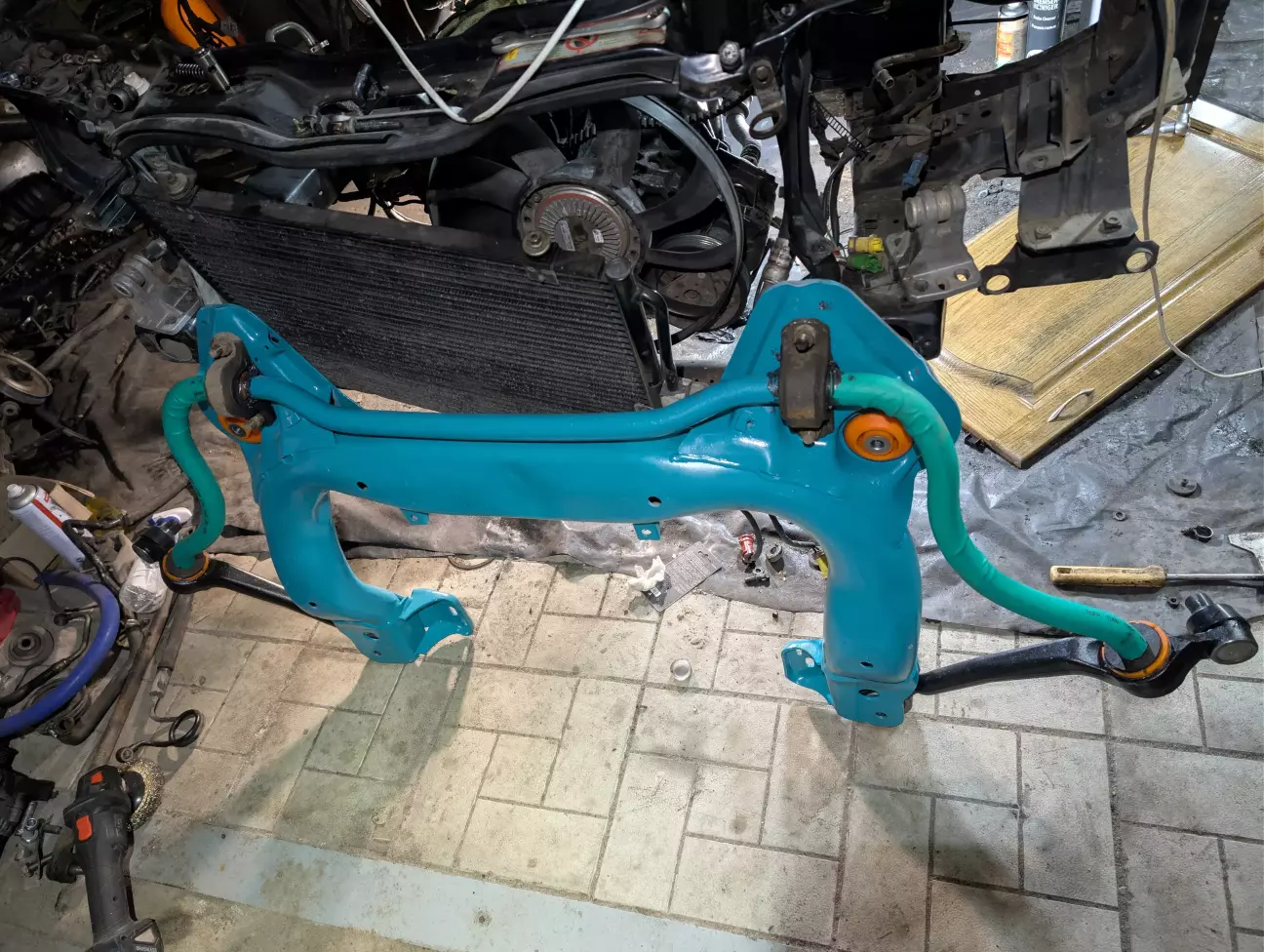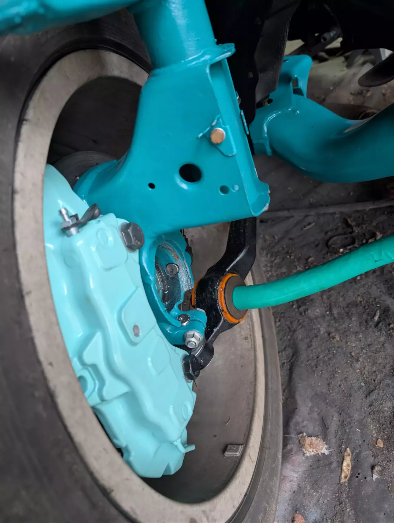 Кулаки були повністю відпіскоструєні до чистого металу. Після цього був епоксидний ґрунт, антигравій, фарба. Колір фарби обирав спеціально. Чимось він мені зайшов, і це було вже після того, як обрав колір супортів. Про гальма буде окрема тема, тому про них не тут. З неприємного — це те, що на одній з ступиць одна різьба колісного болта була пошкоджена, і її довелось відновлювати, але пощастило, що лише один виток був пошкоджений, і достатньо було пройтись метчиком.
