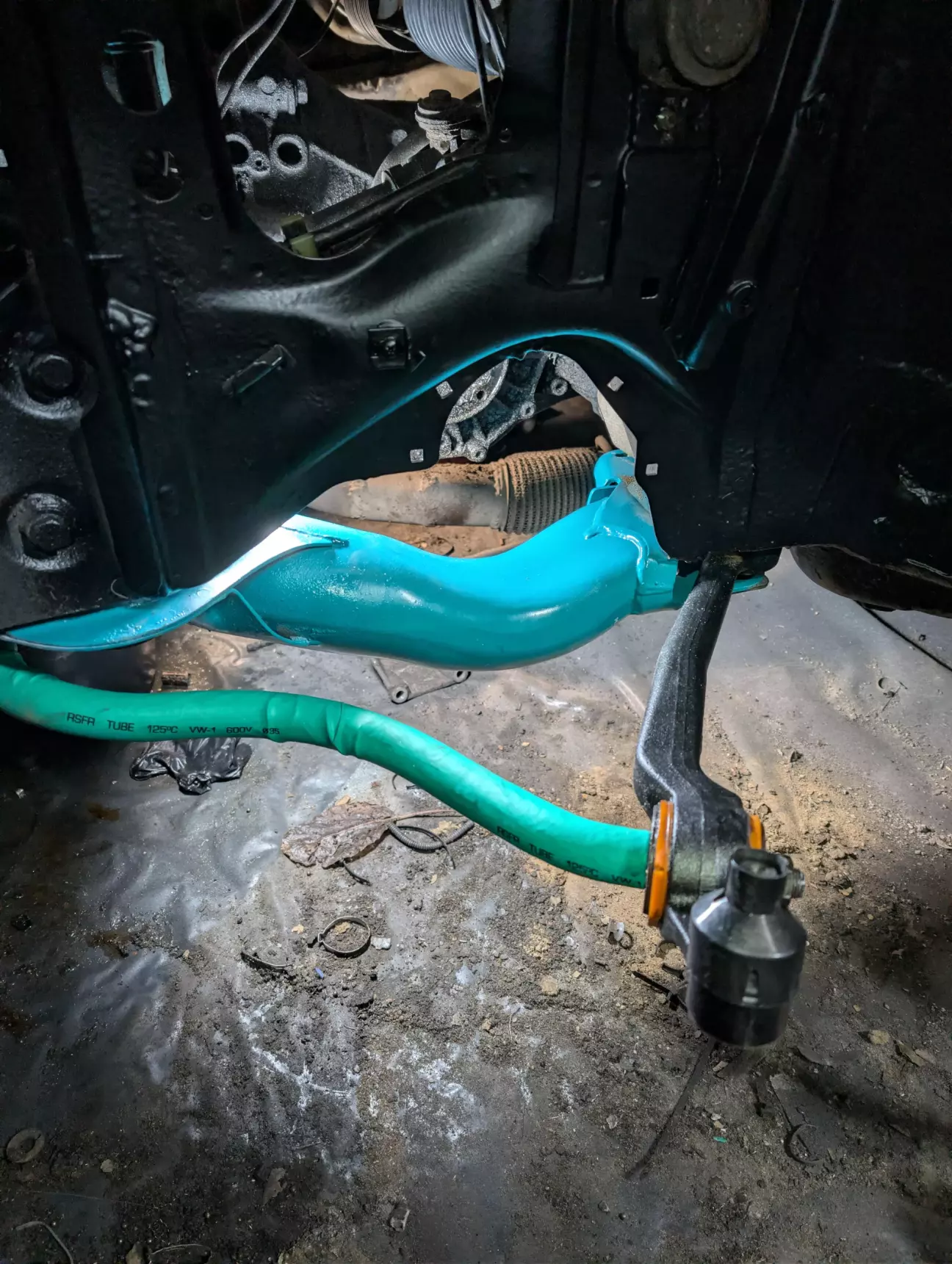 Що стосується ричагів нижніх — придбав нові і не морочився з реставрацією. З авто зняв вже реставровані, і, дивлячись на них, довіри до реставрації вони не викликали зовсім. Наконечники рульових тяг теж нові, і вирішив також поставити тяги від ески, яка з V8 мотором: для тих, хто не знає, вони не прямі, а з вигином. Тут логіка незвична дещо. Я собі зміг знайти пальники від дизеля — і лівий, і правий — в непоганому стані. І, щоб пальники сиділи красиво, вирішив змінити і самі рульові тяги. Втулки в них теж поставив поліуретан.