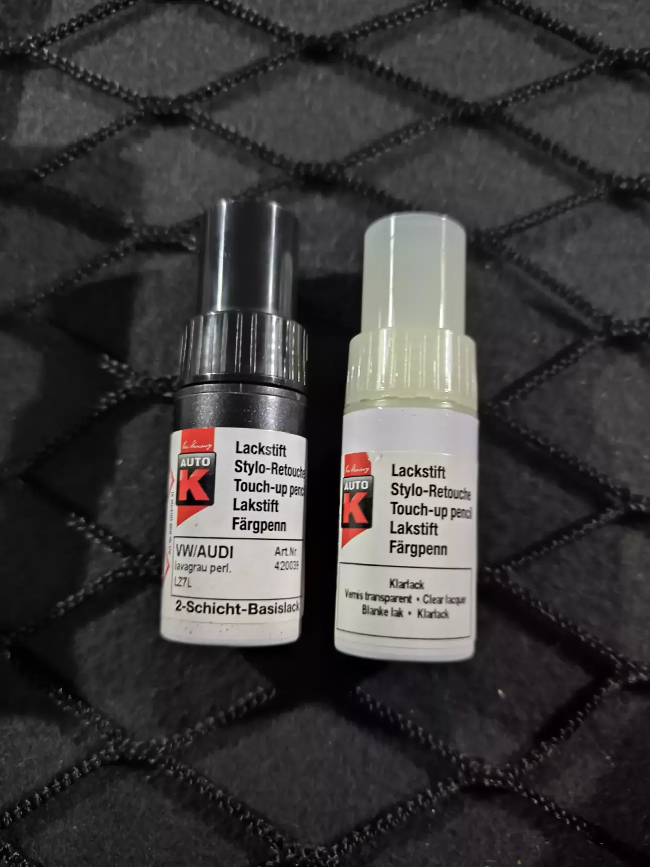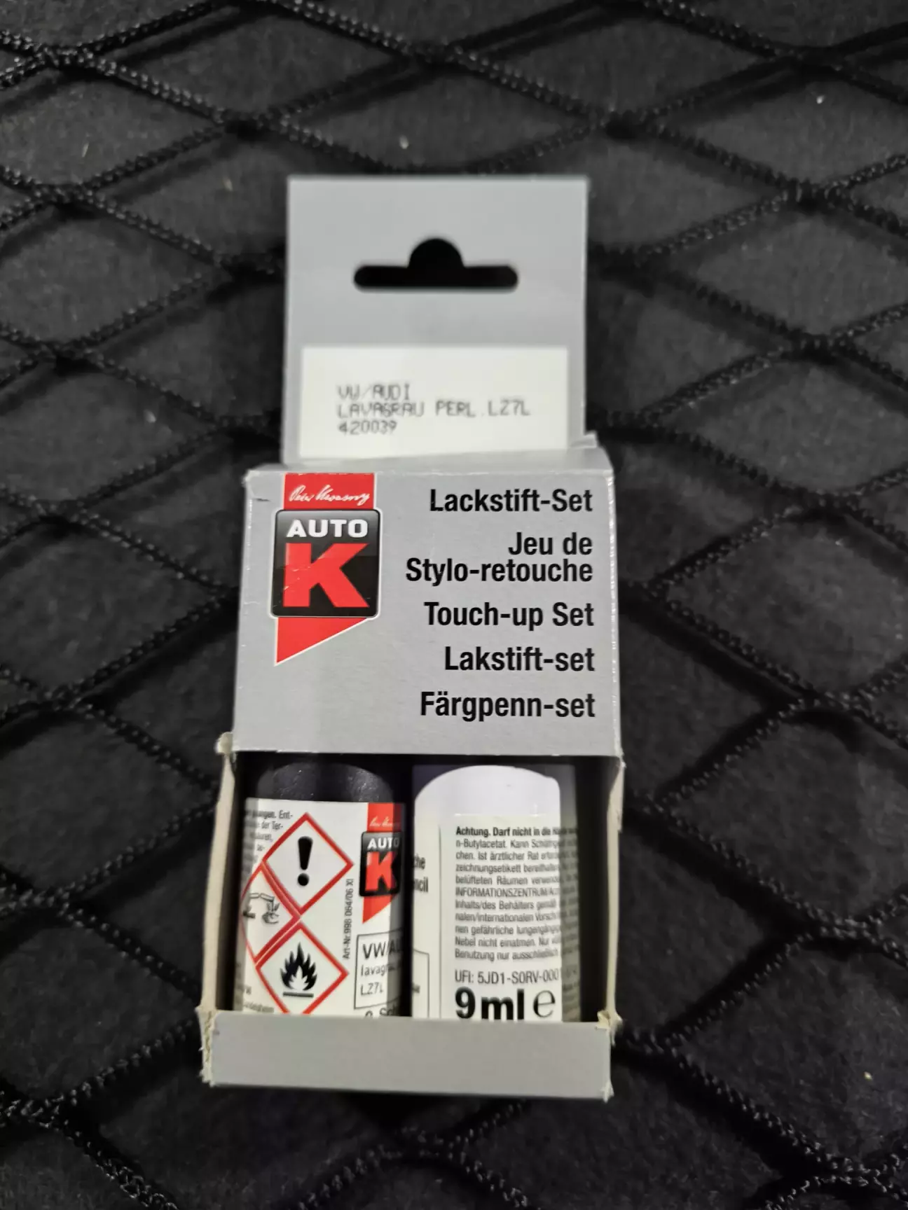 Поискал в интернетах сначала карандаш для этого дела и нашел еще лучше "набор для подкраски" и решил приобрести себе данный набор. Набор состоит из двух флакончиков по 9 мл.: пигментная база (цвет соответствует коду окраски машины) и бесцветный лак с крышечками-кисточками.
