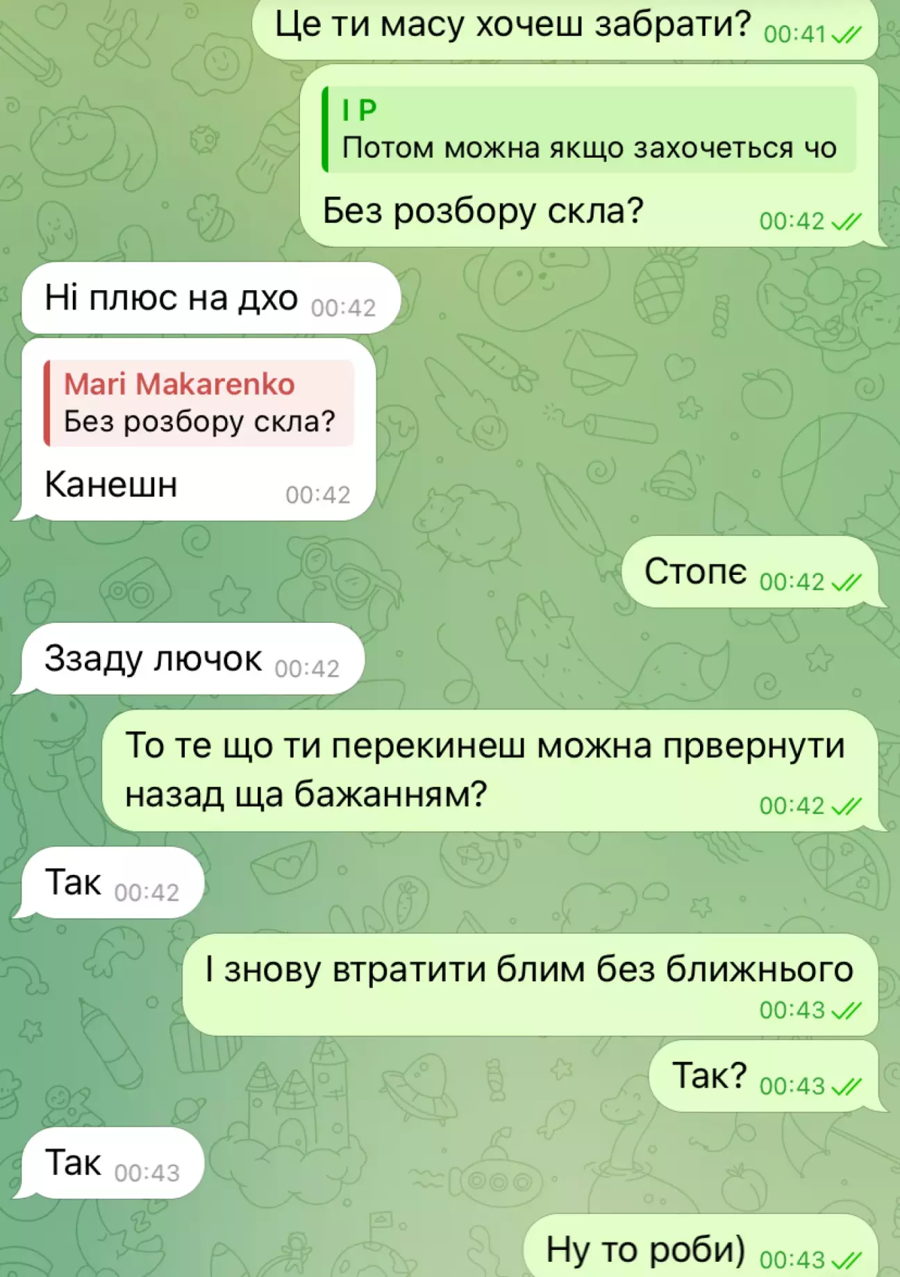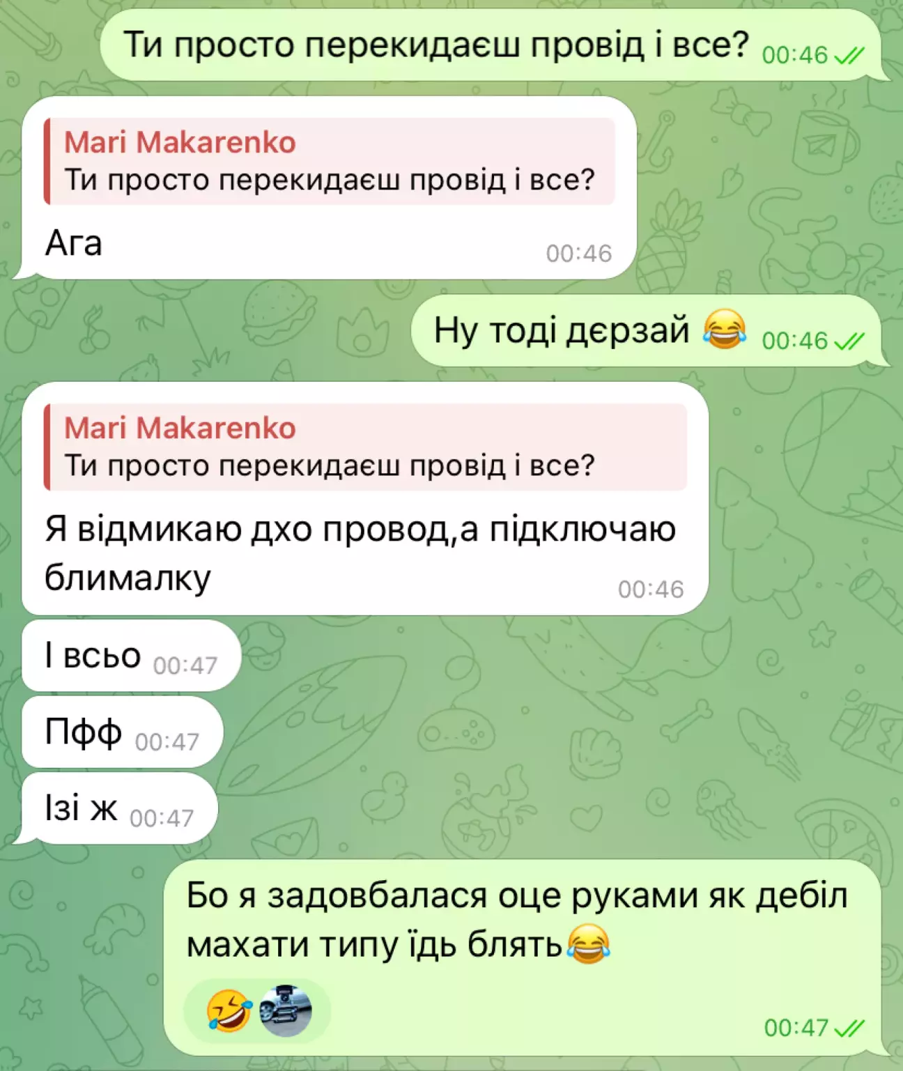 Ця переписка мала бути тут, без закулісся не буде видно тих емоцій, а точніше терпіння Ігоря і мого: «а буде то? А шо буде? А як буде? Поняла! А нє стоп нічо не поняла» 😂😂😂