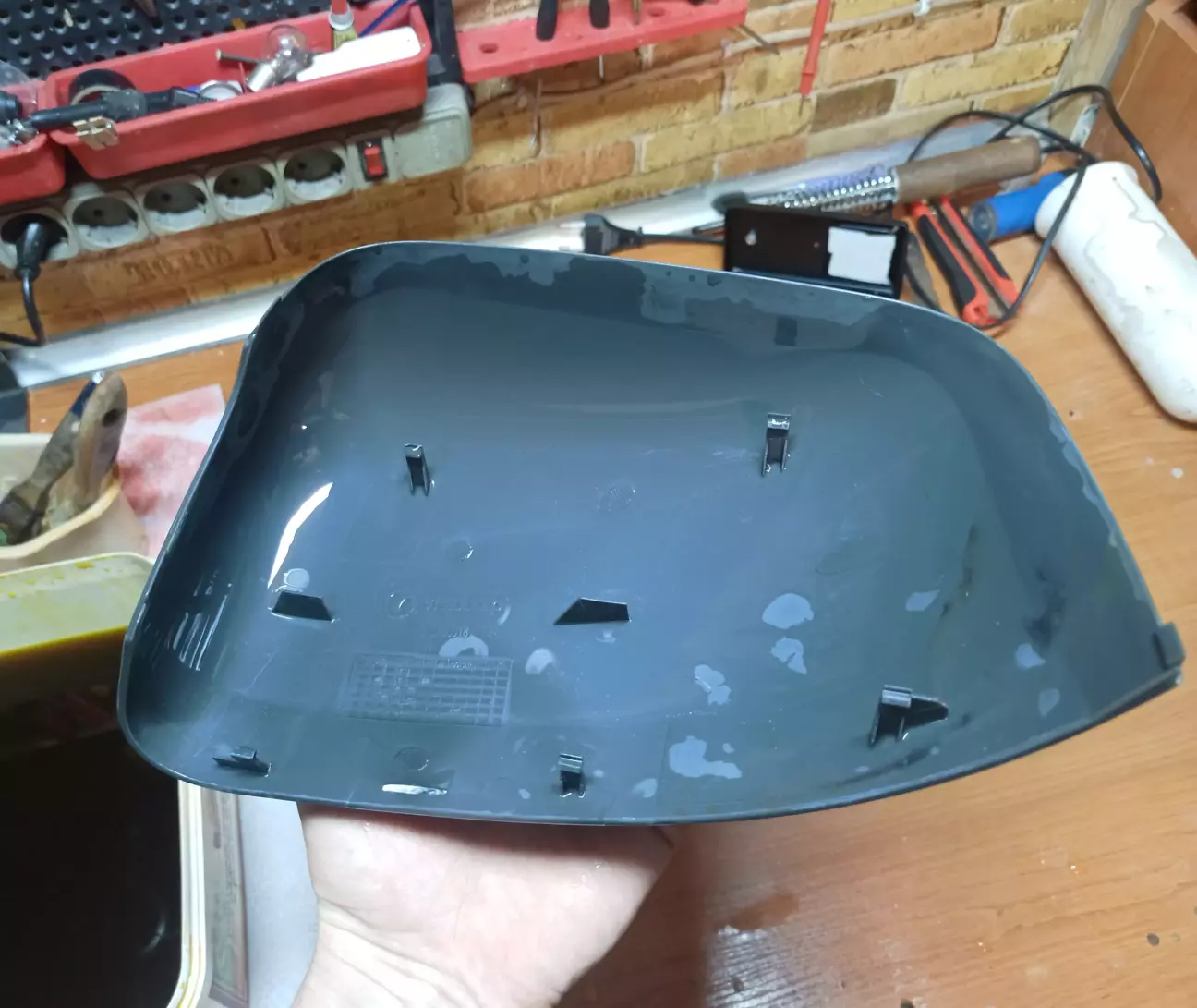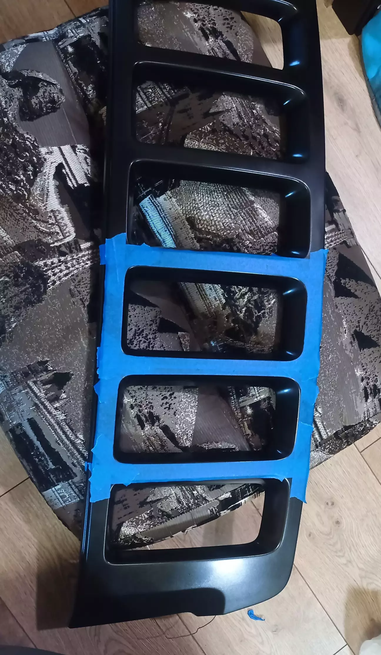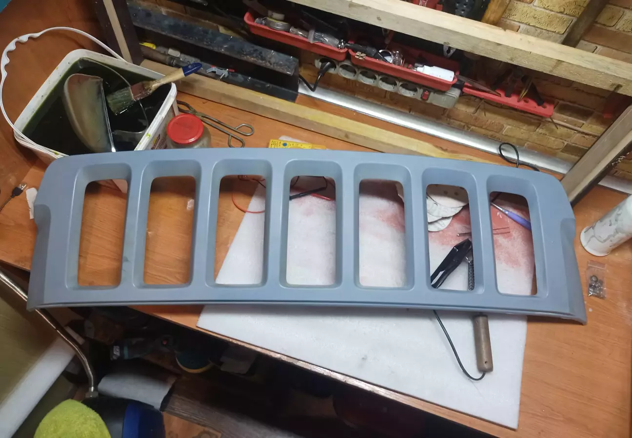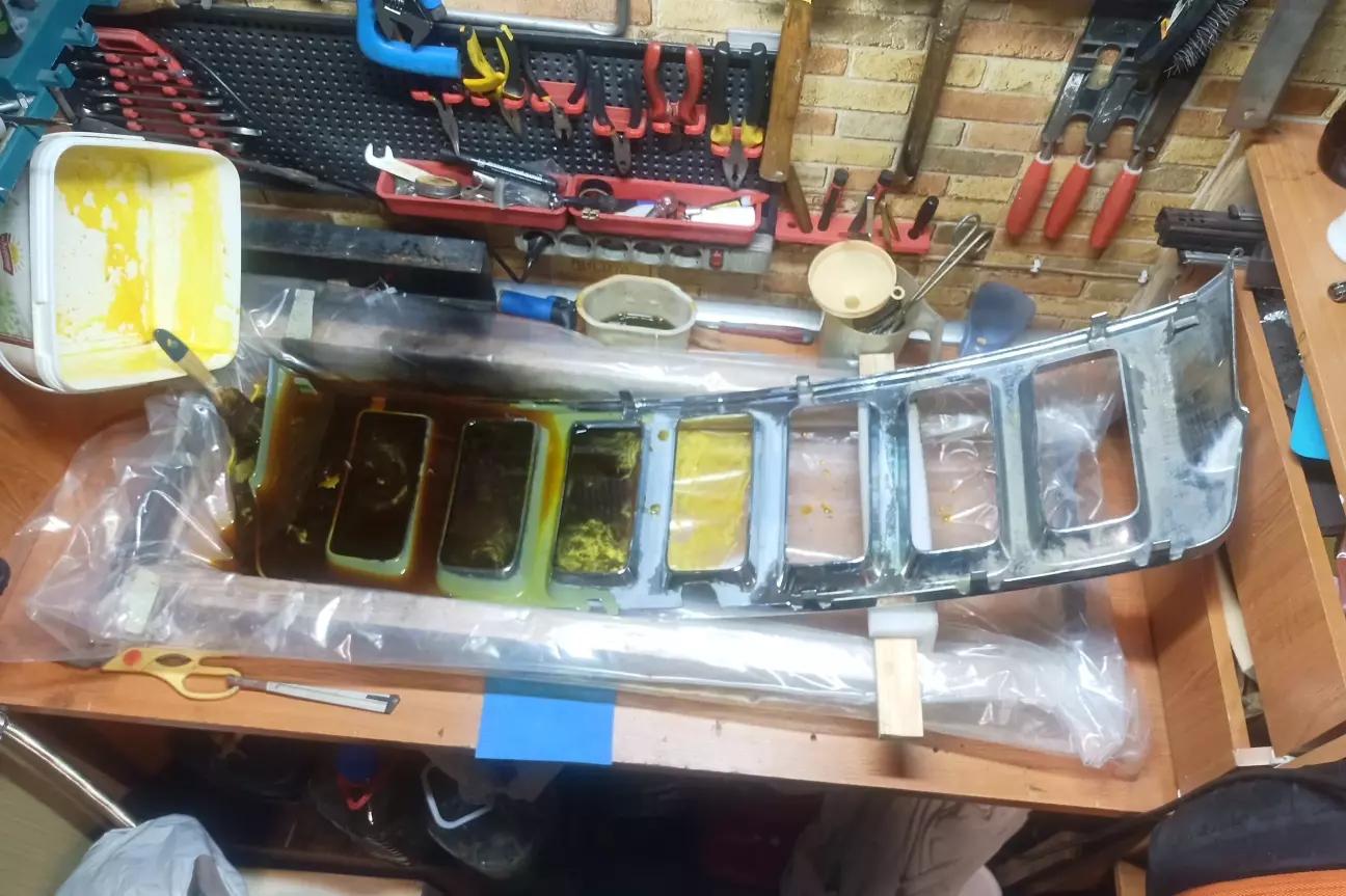 Найважча частина роботи зроблена. Решітка радіатора відкисала майже тиждень. По-перше значно товстіший шар хрому, по-друге її розміри не дозволяли занурити повністю. Тож робив фрагментами, періодично змінюючи позицію.