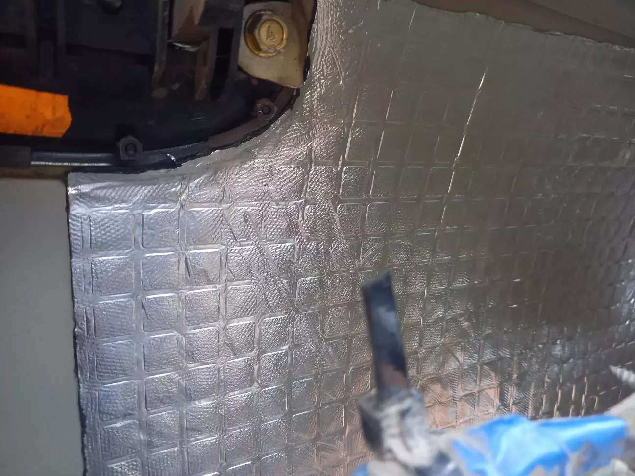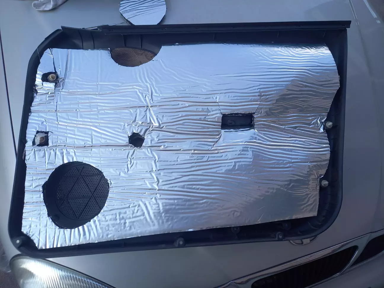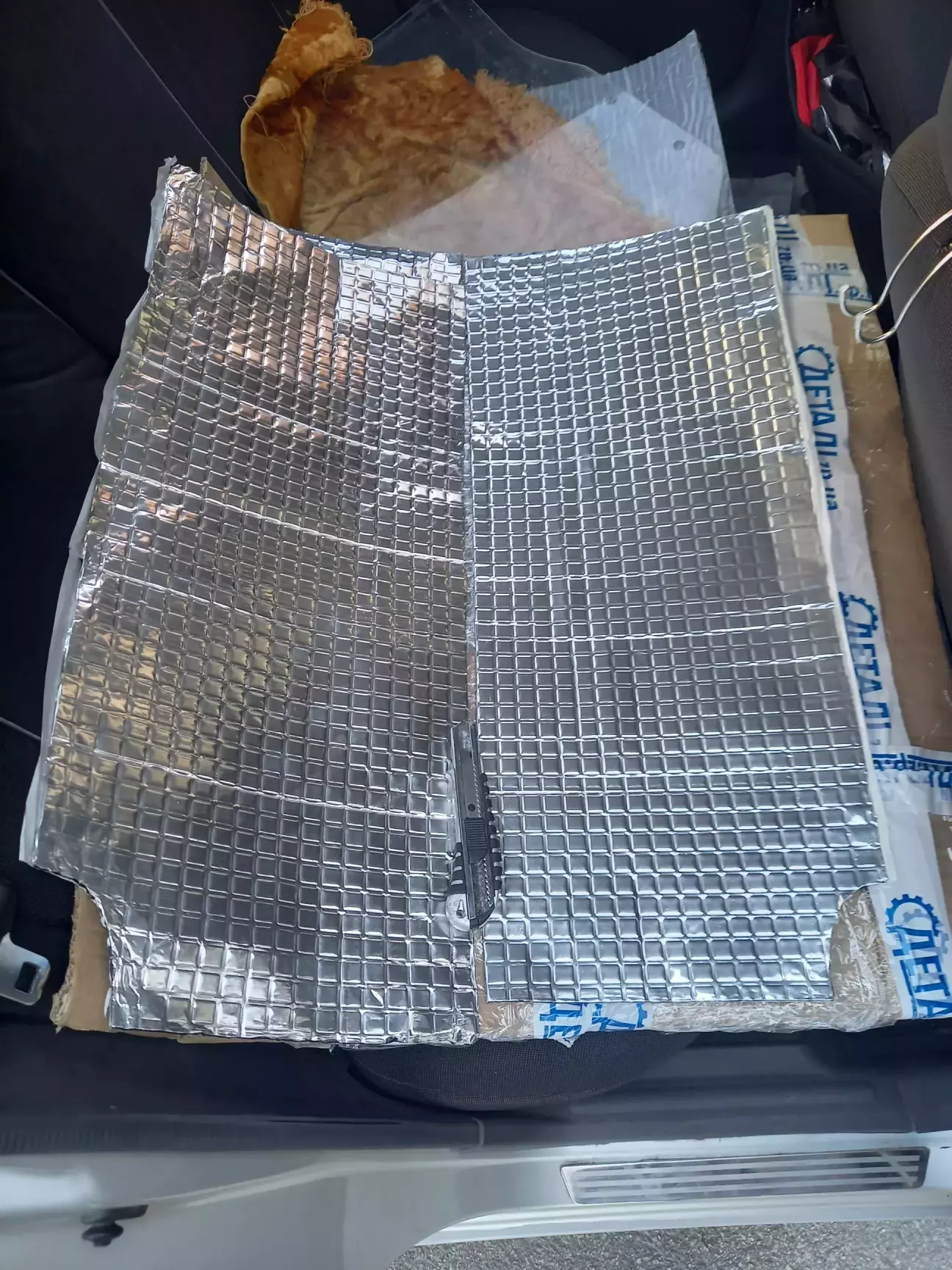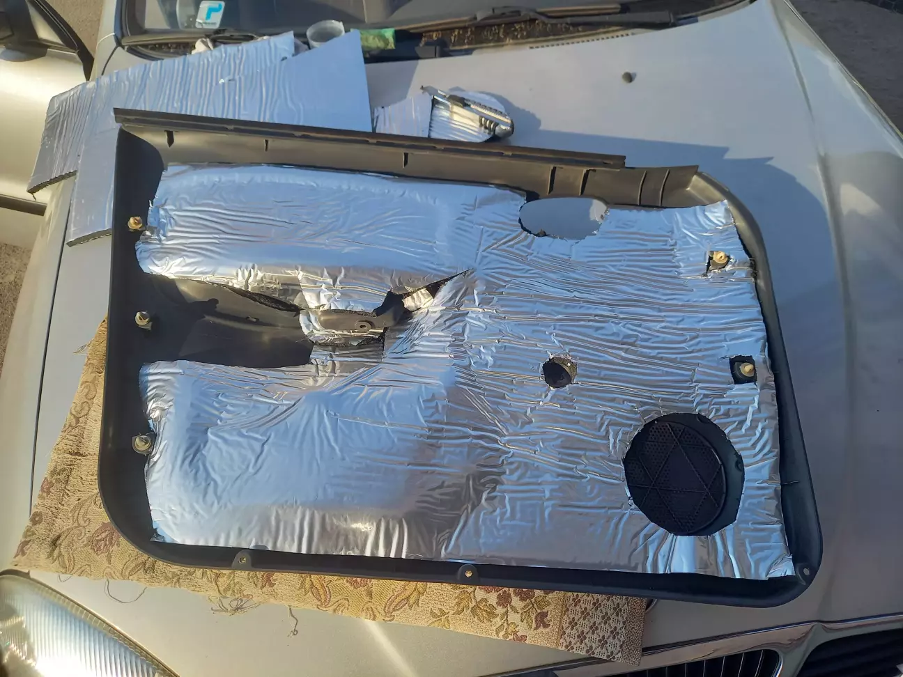 Вичистив карти з внутрішнього боку. Вирізав по місцю й поклеїв шумку. З товщиною не сильно вгадав - 10 мм дуже впритик стала. Ну й фольгована тільки тому що така була))