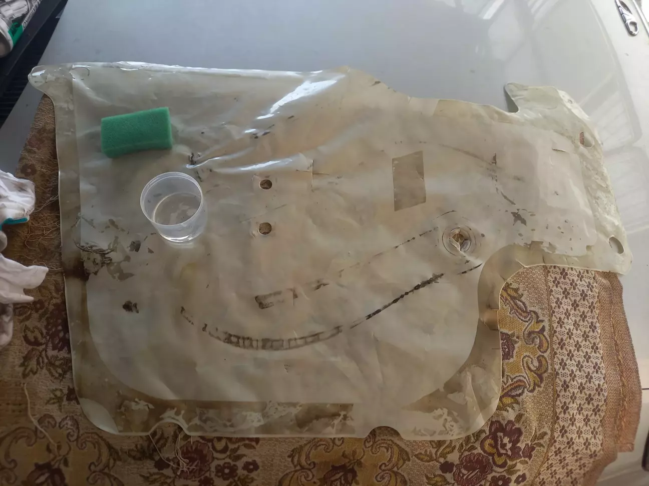 Далі технічним спиртом вимив бруд й залишки клею з вологозахисту та встановив його на місце з допомогою двостороннього скотчу: