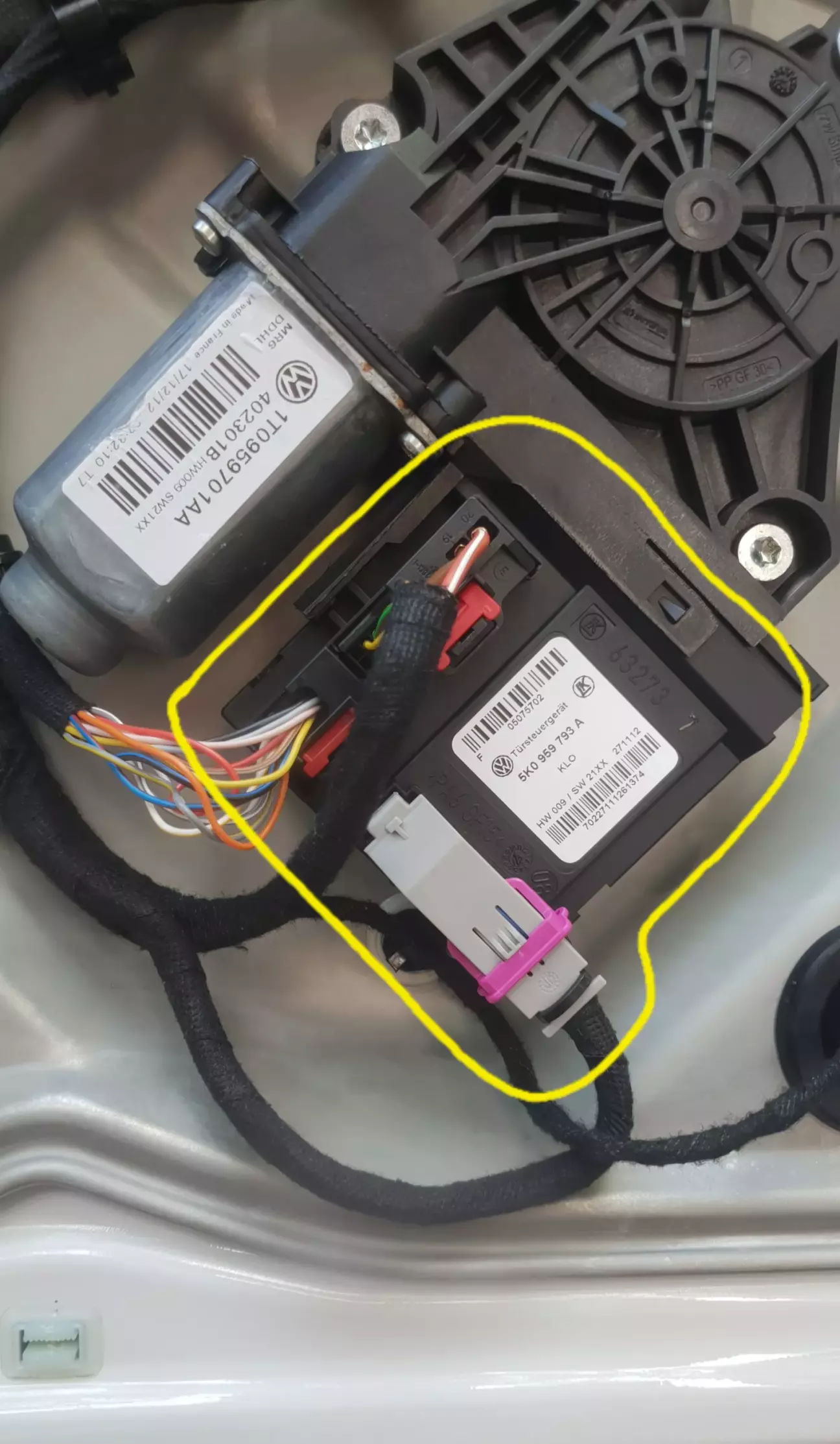 Провід СІРІЙ/червона смужка йде в Дверний Блок 5K0959793A, сірий роз'єм 1J0972977G