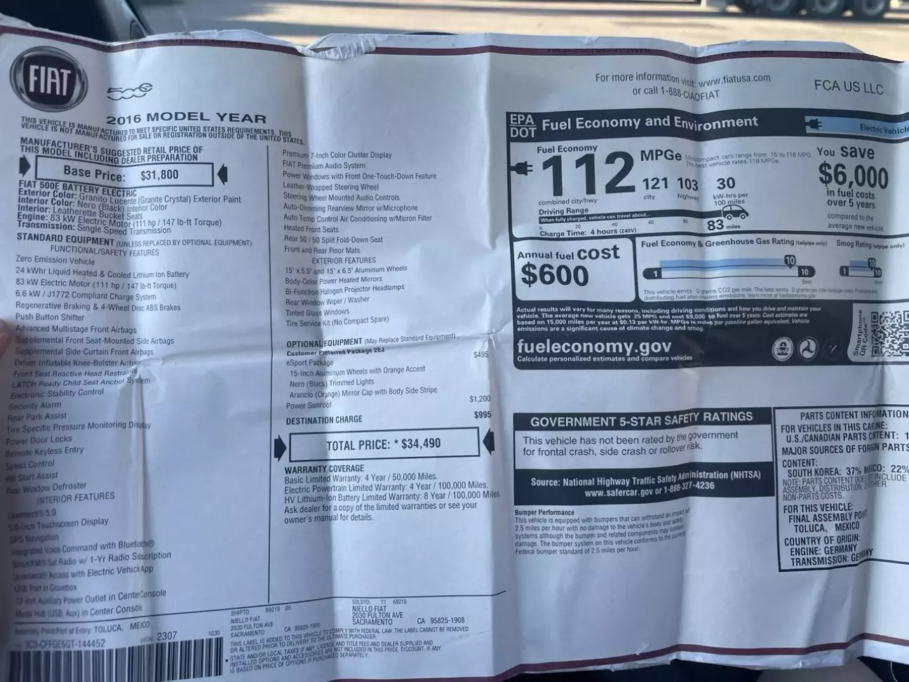 Автомобіль Fiat 500e (2016) було придбано попереднім власником та пригнано з Норвегії. У бардачку збереглася офіційна розшифровка комплектації та вартість авто, яку варто залишити для історії та документування.