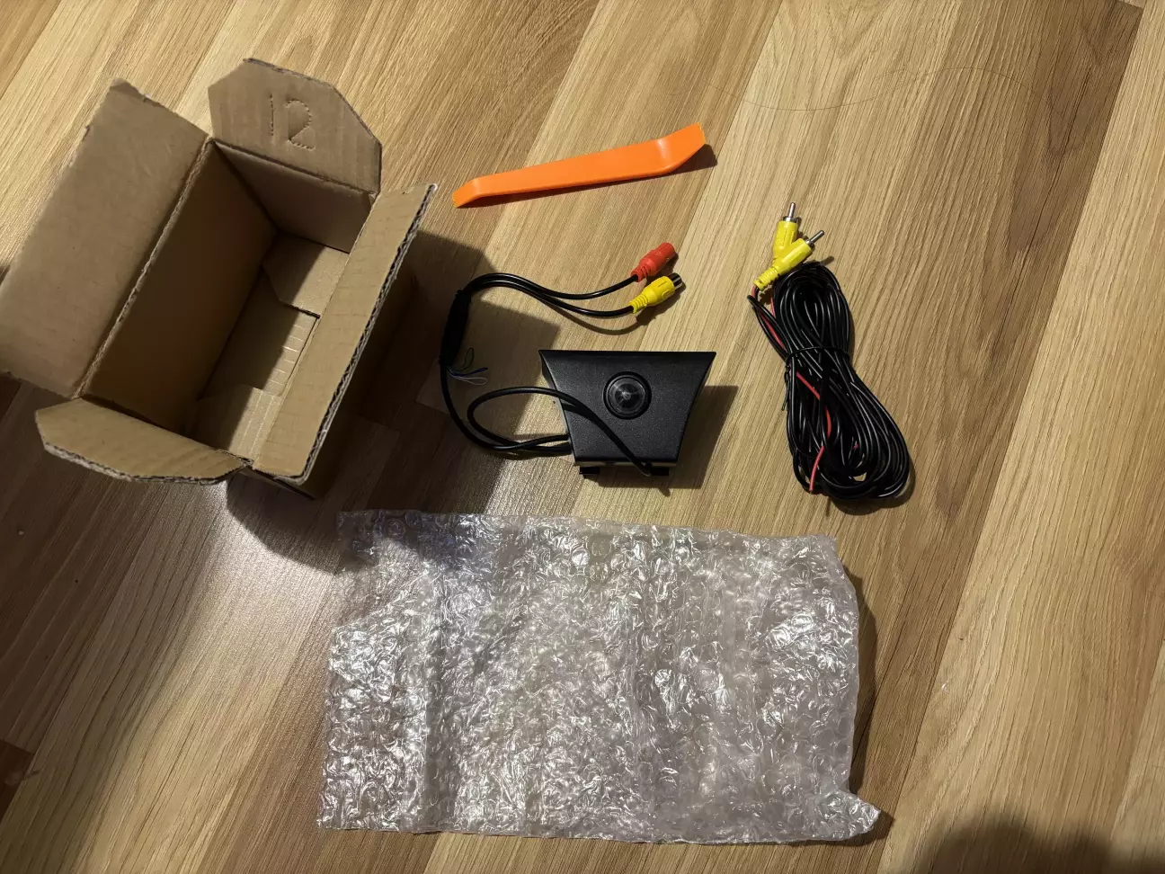 У комплекті йде 6-метровий провід із тюльпаном і окремий півметровий провід живлення. У проводу з тюльпаном теж є проводок на 12 вольт, і продавець писав, що можна до нього пвдключити 12 вольт і має працювати. Перевірив — з ним камера не запустилася, тому окремо докупив і протягнув провід на 12 вольт від магнітоли до камери.