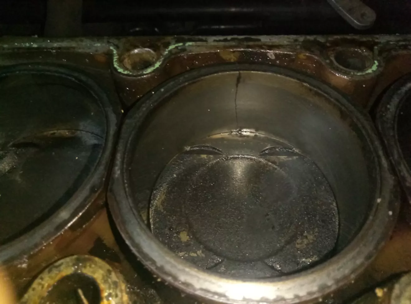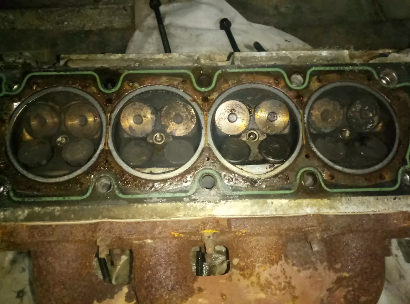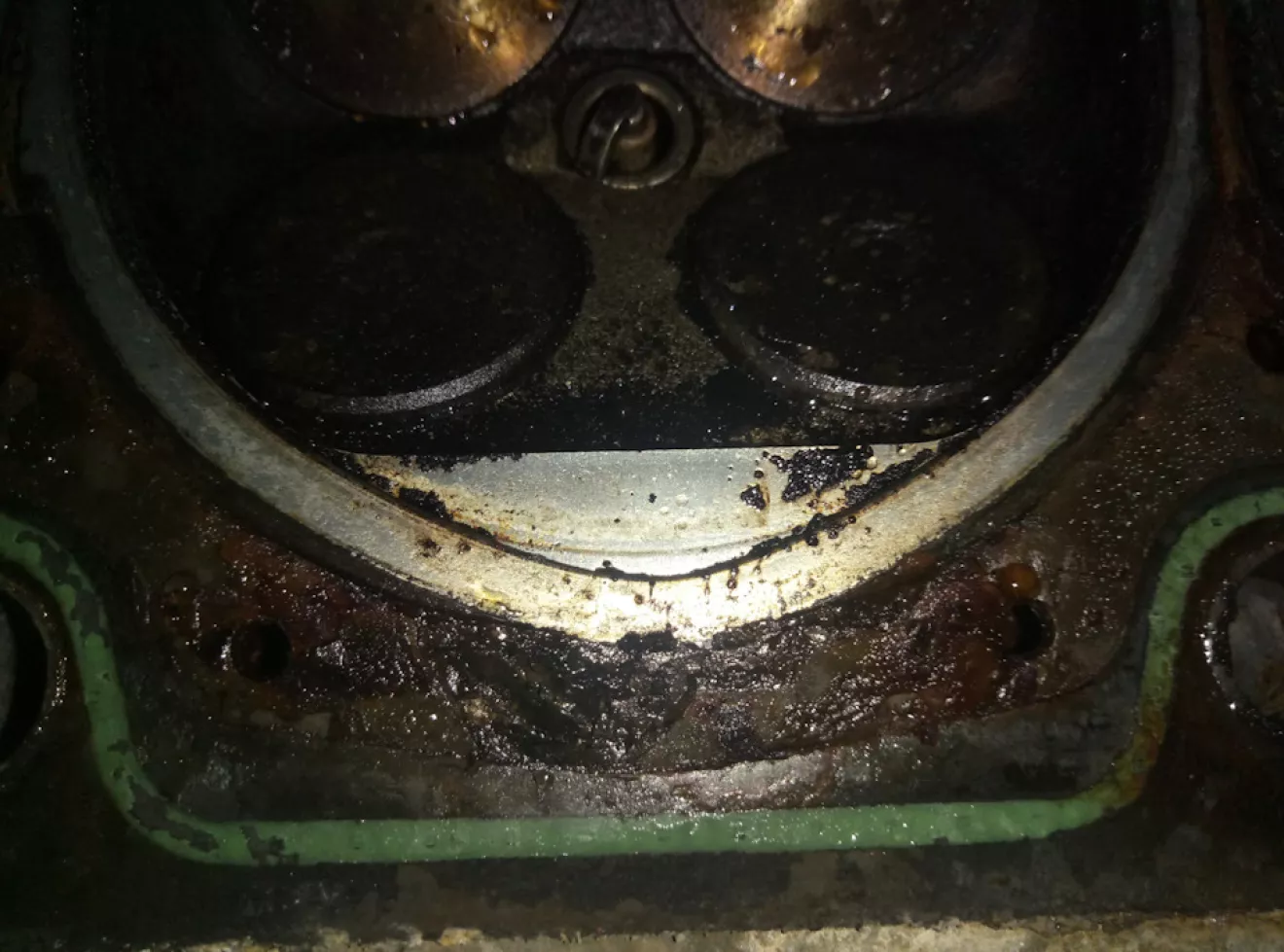 Как писал ранее 3тий целиндр был мокрый, начал разбирать снимать гбц. Сняв голову с третей попытки: (очень тяжолая) (снимал сам) да увидел место прорыва прокладки,