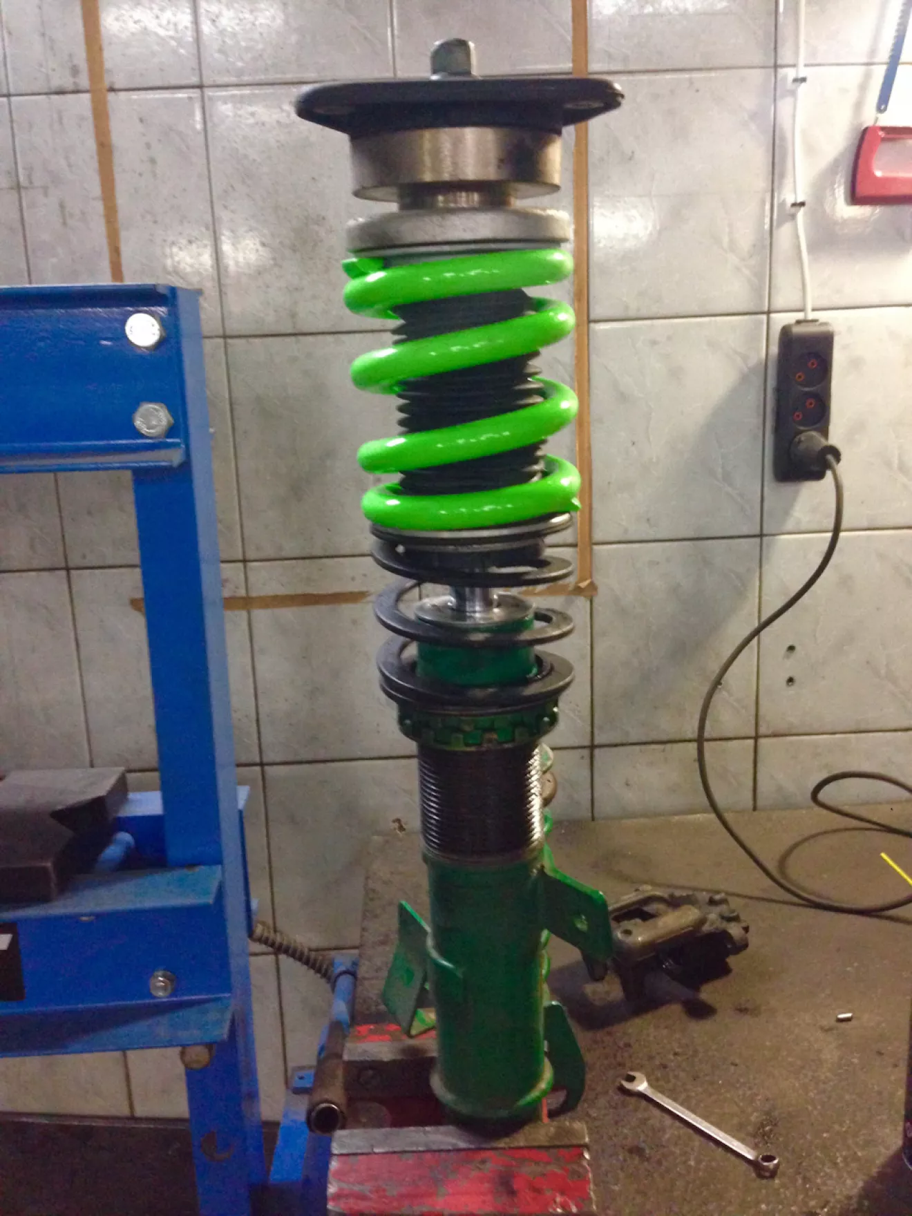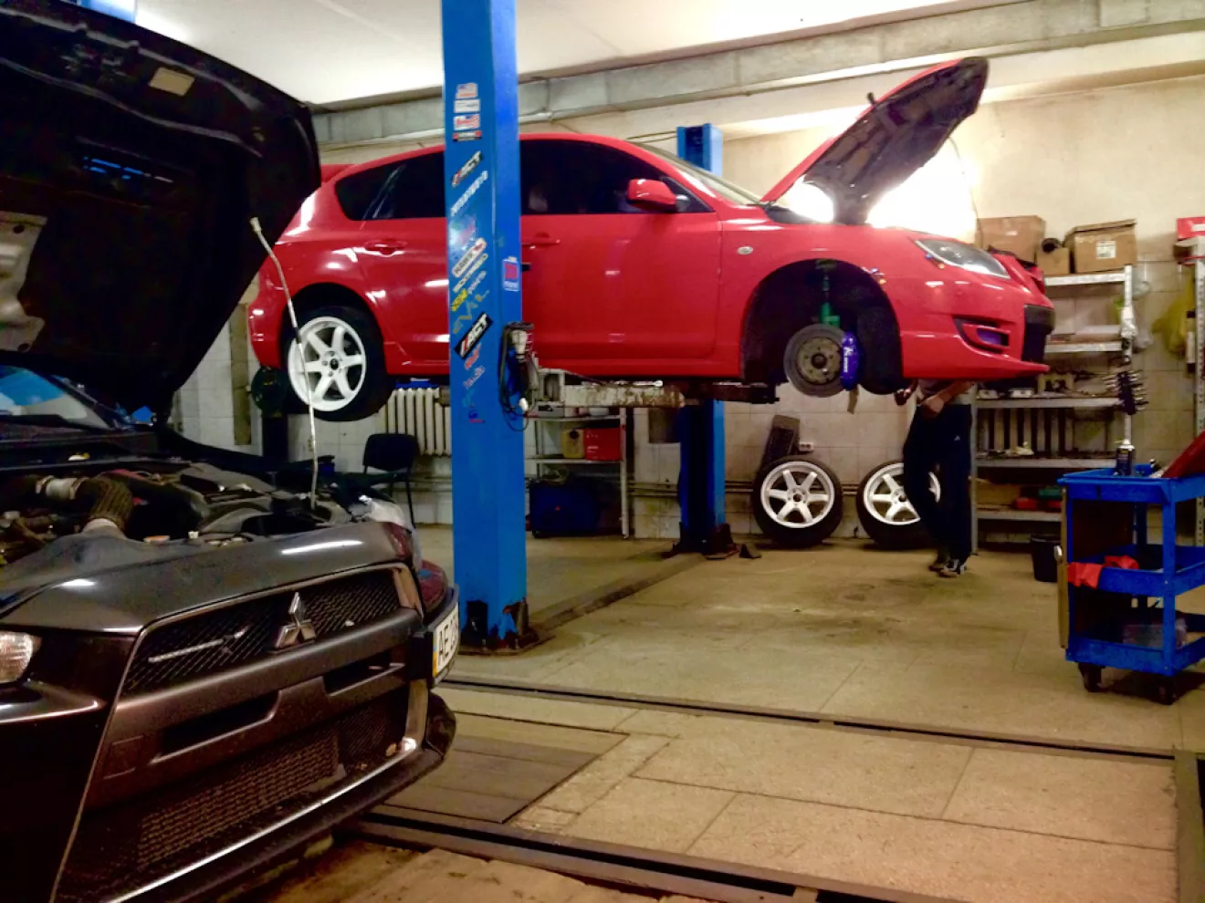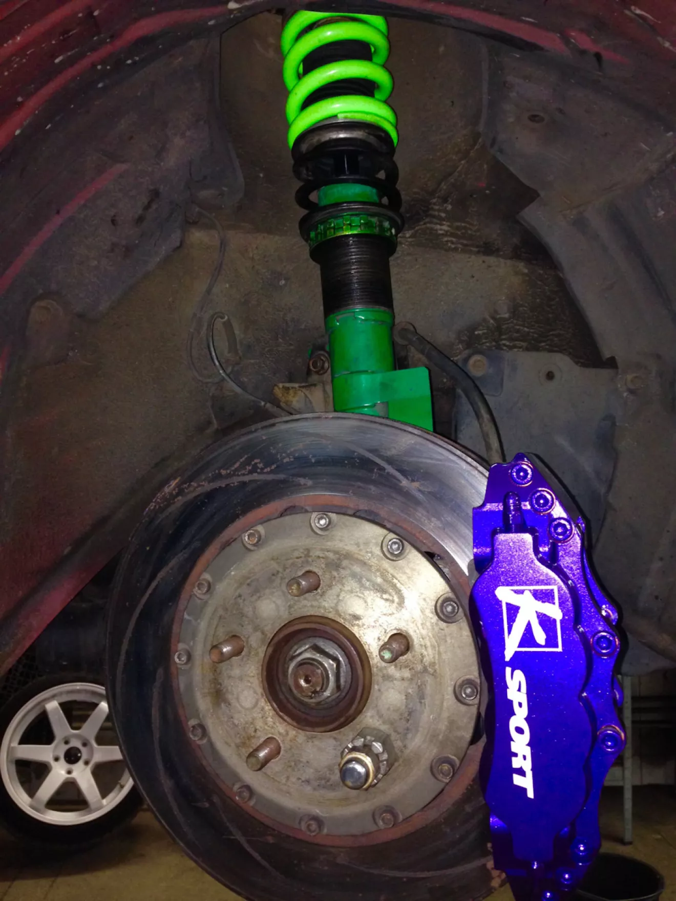 Всем привет, дамы и господа…сегодня поехал сервис на установку всех тюнячек что собрал за последнее время, 8-ми поршневые суппорта Ka-Sport начну с них, все стало болтон, вот с дисками немного не угадал, стали в притык, и уперлись в суппорт, не хватало буквально 3 мм, на время взял у ребят 7мм проставки, все стало отлично, уже радует, я заказал в круг 5мм 5.114 3 цо 67.1 завтра поставлю.Установили пружины Customs_springs тачка села как я хотел, даже думаю ещё чуть ниже опустить, (с занижением буду ещё завтра разбираться, пока не все устраивает)думаю на перед чуть мягче пружины поставить.Ну и наконец-то я сменил свои старые диски, новые покрасил в белый(порошком)на следующий год может перекрашу в Тиффани)