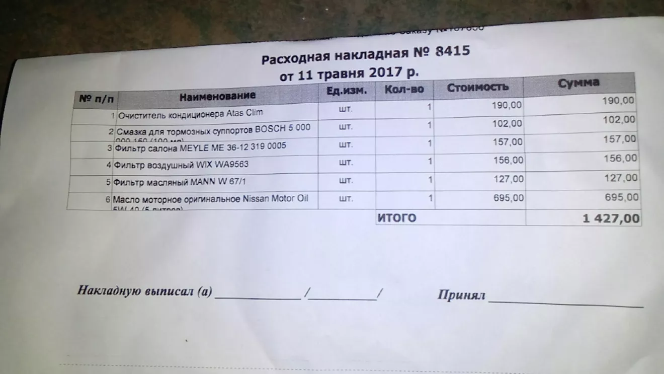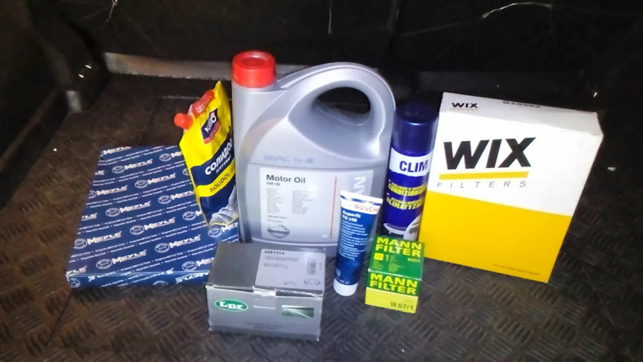 Решил сделать небольшое то. Масло NISSAN, меняю через 7-8000, масляный фильтр MANN. Воздушный и фильтр салона недорогие брал, так как меняю их часто. Заодно почистим климат контроль и сменю передние тормозные колодки (в списке нет, брал ещё в начале весны), ещё надо купить краску для суппортов.