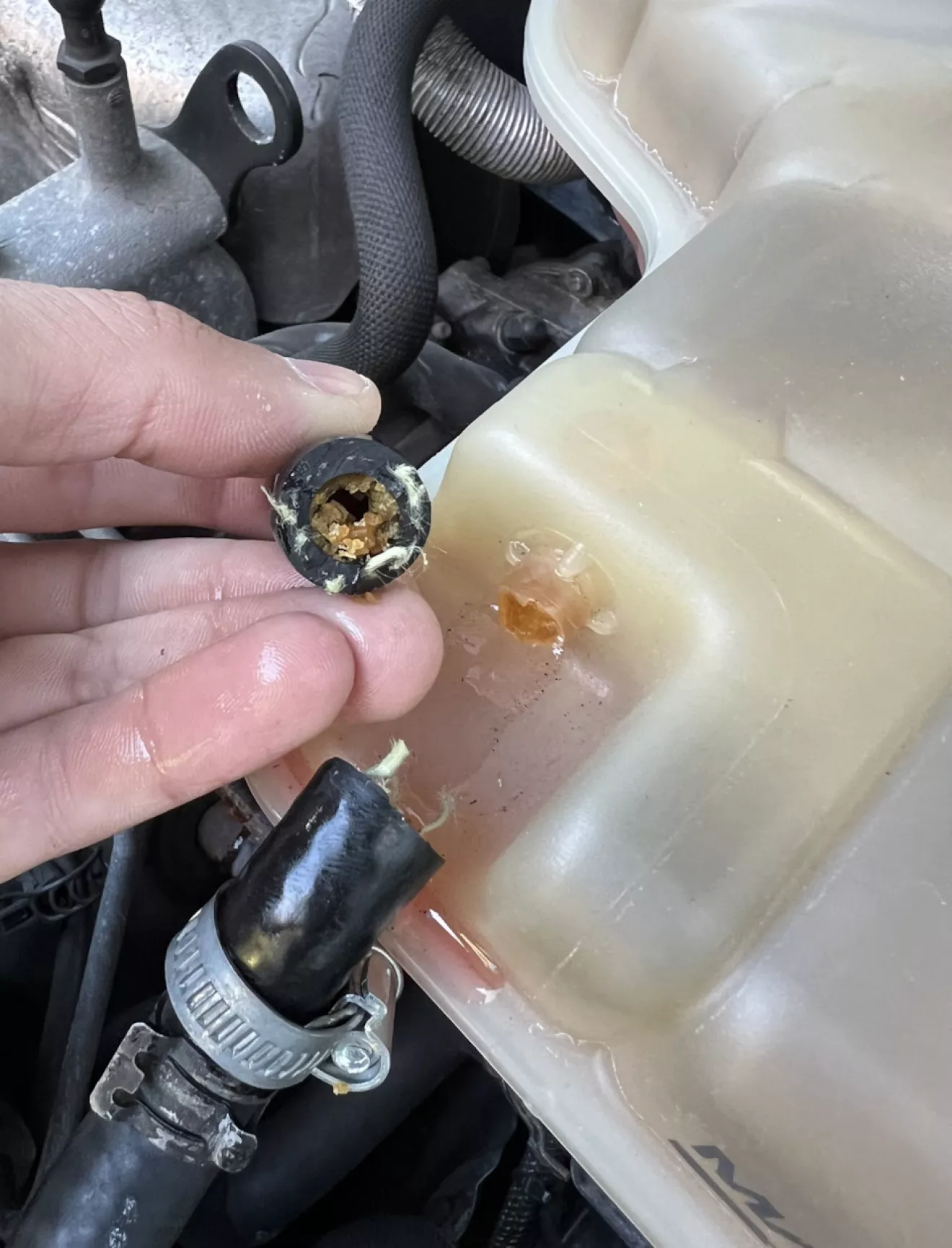 Года 3 назад начали появляться капли антифриза. Напялил дешманский хомут и подтянул. Недавно снова появились подтёки. Собрался ехать на дачу, но думаю, надо сначала хомут подтянуть что ли … Только отрежу всё же кусочек трубки, может, хомуток продавил её. Взялся за трубку, а она вместе с штуцером внутри осталась 🤷🏻♂️ Пластик рассыпался на мелкие крошки 🫠